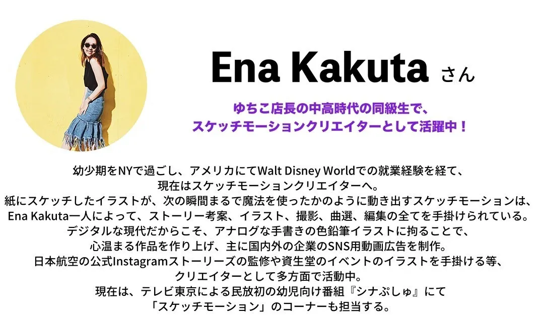 そして、グッズのデザインはゆちこ店長の中高時代の同級生である、スケッチモーションクリエイターのEna Kakutaさんにしていただくことになりました!色鉛筆で生み出す作品はどれもとっても素敵なんです…!完成をどうぞお楽しみに!!
