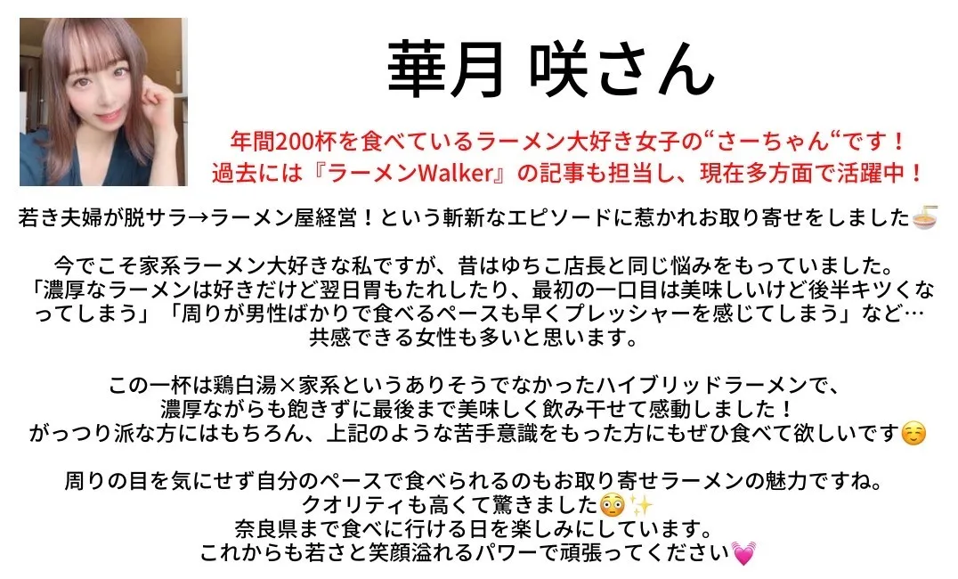 過去には『ラーメンWalker』の記事も担当し、現在も多方面で活躍中の華月咲さんからも嬉しい応援メッセージをいただきました!!