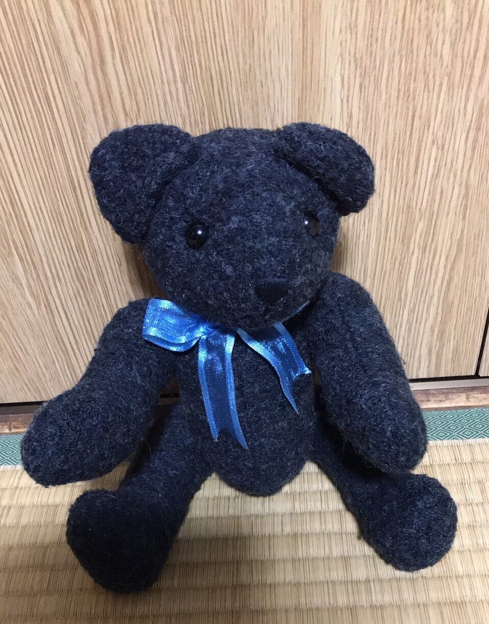 こちらの紺色のリボーンベアはお祖母様のコートからリメイクしたリボーンベア。