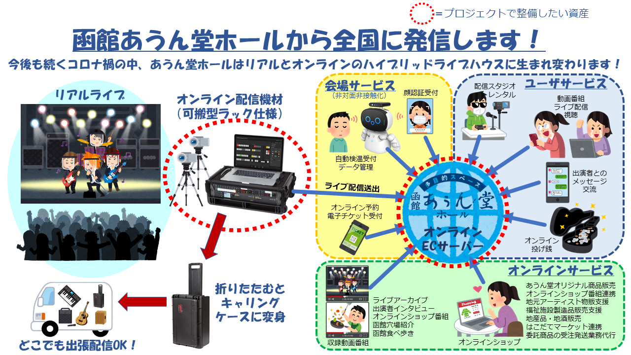①配信ライブや動画番組コンテンツの制作配信機材を整備し、配信ライブだけでなく動画番組をお届けします。配信機材を有効活用できるよう、出張配信業務もできるような可搬型機材を導入します。