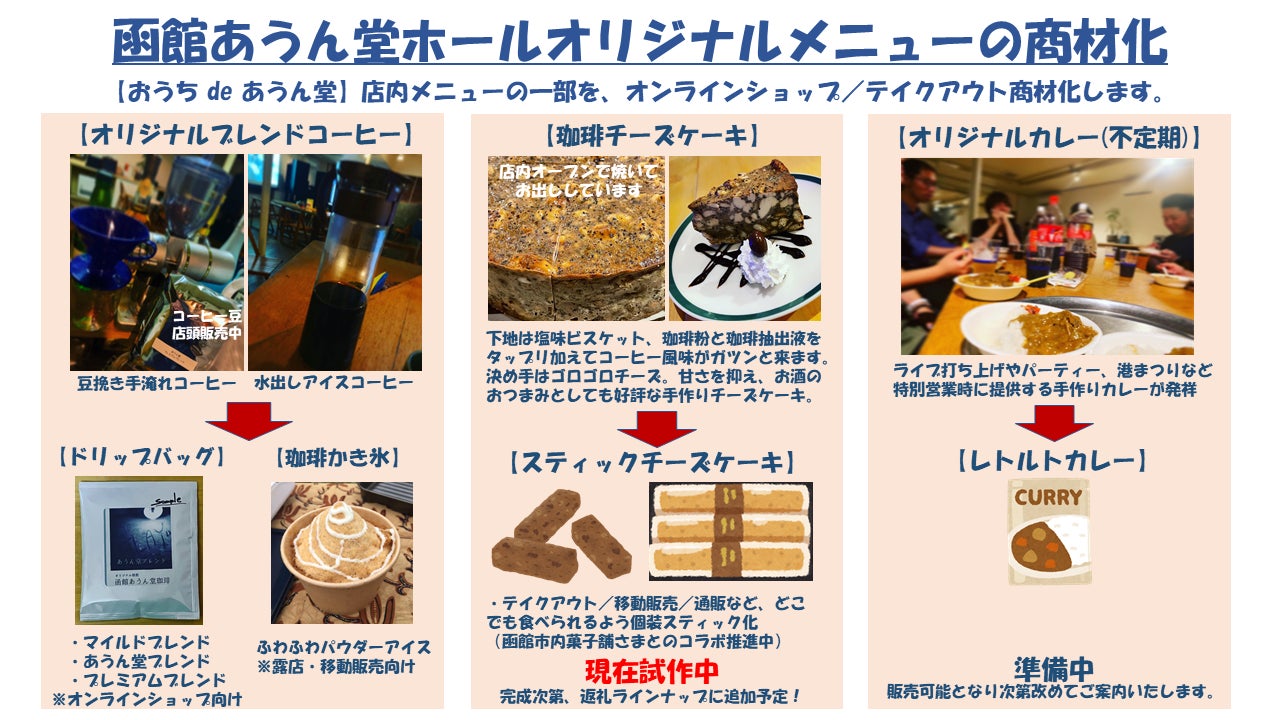→店内でお出ししているオリジナル珈琲、手作り珈琲チーズケーキ、おつまみ、カレーなどをパッケージ商品化して、テイクアウトやイベント露店販売、オンラインショップで販売します。やがてはお土産屋さんなどでも販売できるものに育てていけたらと思います。お店の飲食メニューをおうちで楽しみながら、配信ライブや動画番組を楽しんでいただければ…それが「おうち de あうん堂」のイメージです。つまりもっと正直なところは、あうん堂への「買って支援」をお願いいたします。