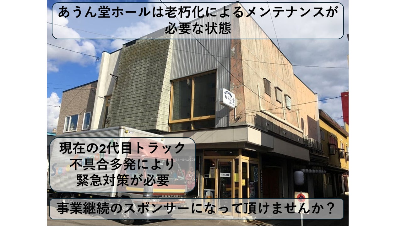 時代が大きく変わっていく中で、変わっていくものと、変わらないものがあるとすれば、函館あうん堂ホールは変わらないものでありたい、大事な思い出や歴史の詰まった函館あうん堂ホールは、このままの姿で将来に残していきたい。そう考えています。 しかしそのためにこそ、新しい時代の中で生き残っていくための新しい業態やビジネスを打ち出しチャレンジしていく必要があると思います。古きよきものを残していくために新しいチャレンジをしていくという考え方です。誰もが苦しいご時世のなか大変心苦しくもありますが、何卒皆様のお力をお借りしたく、ご支援のほどよろしくお願いいたします。