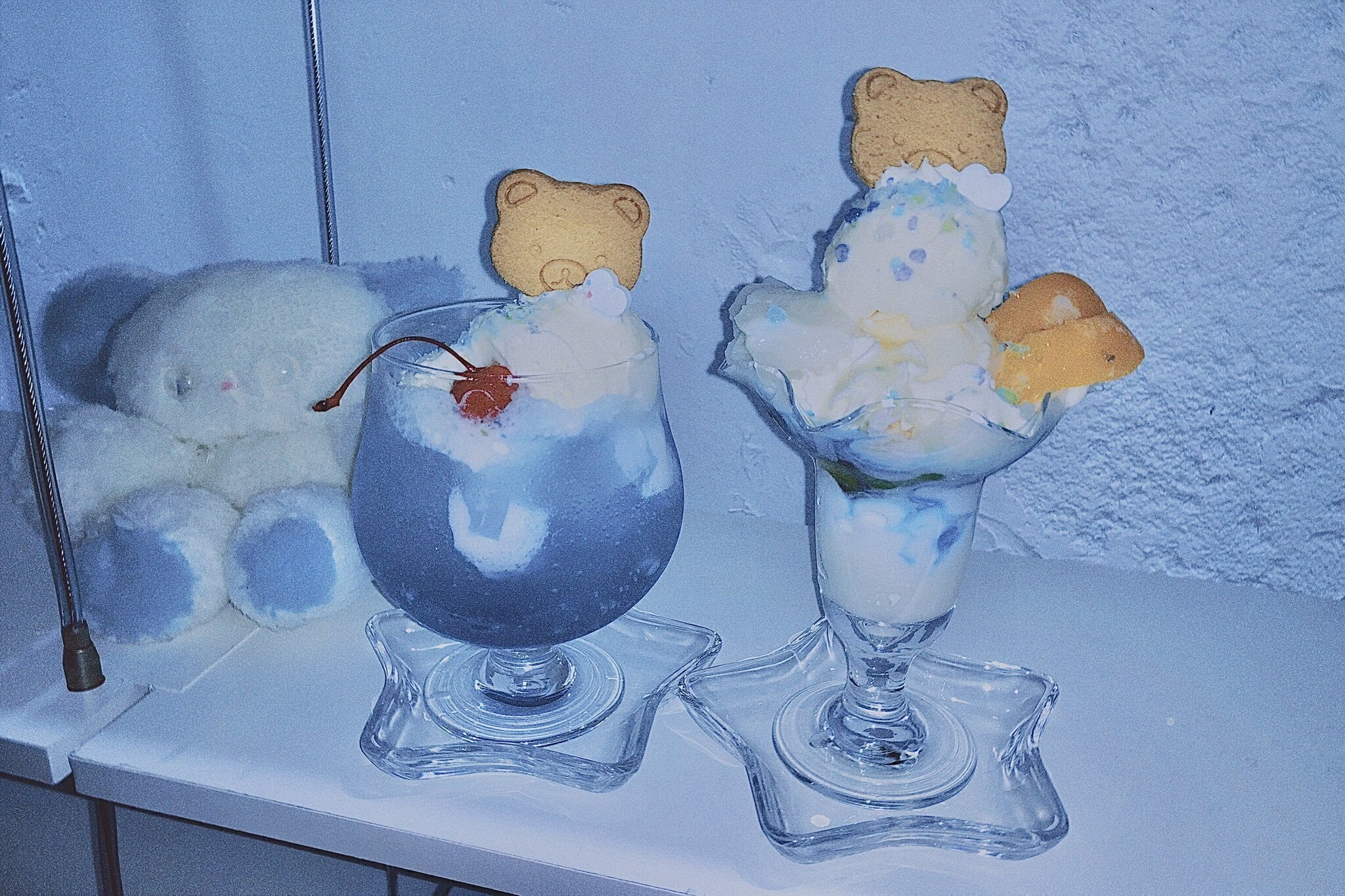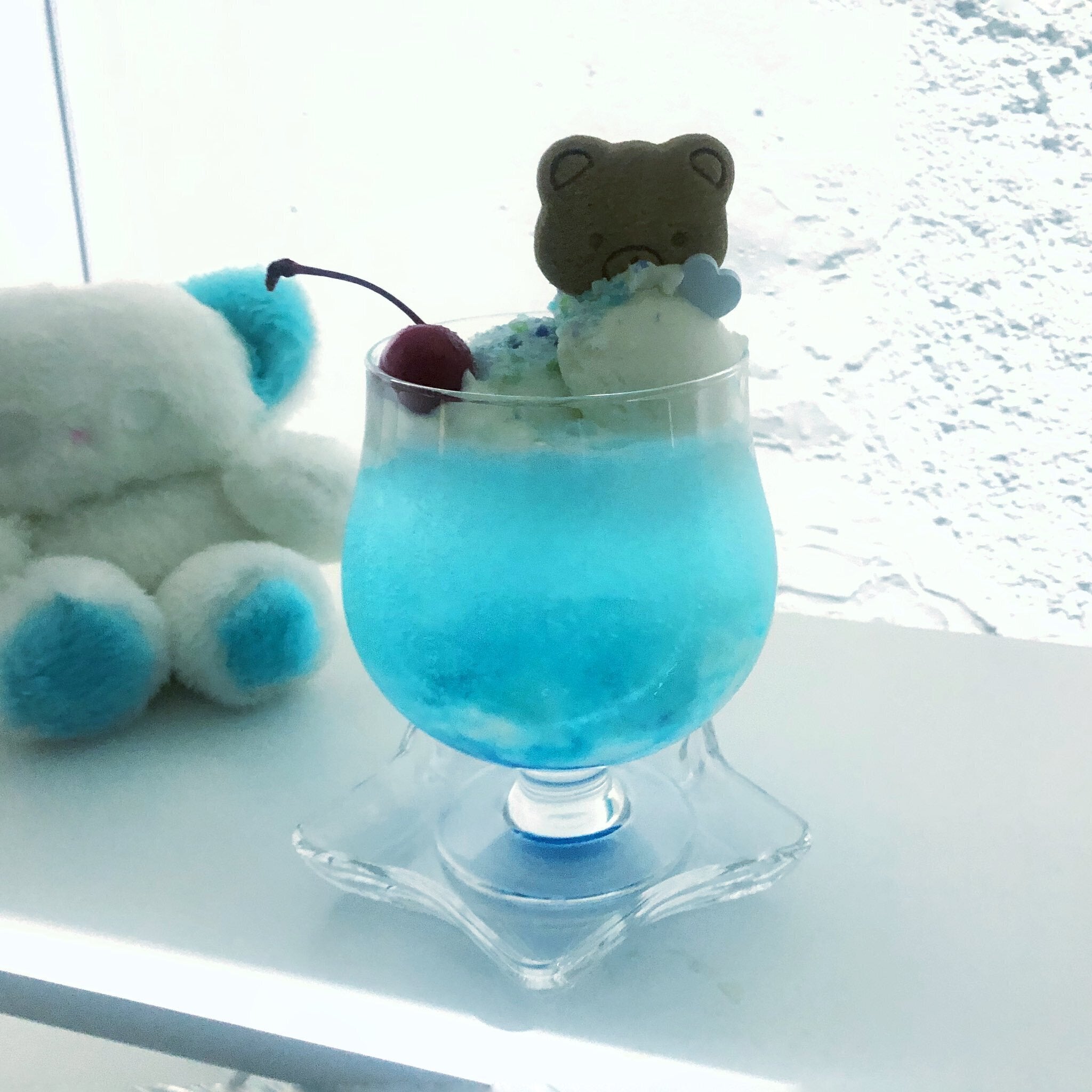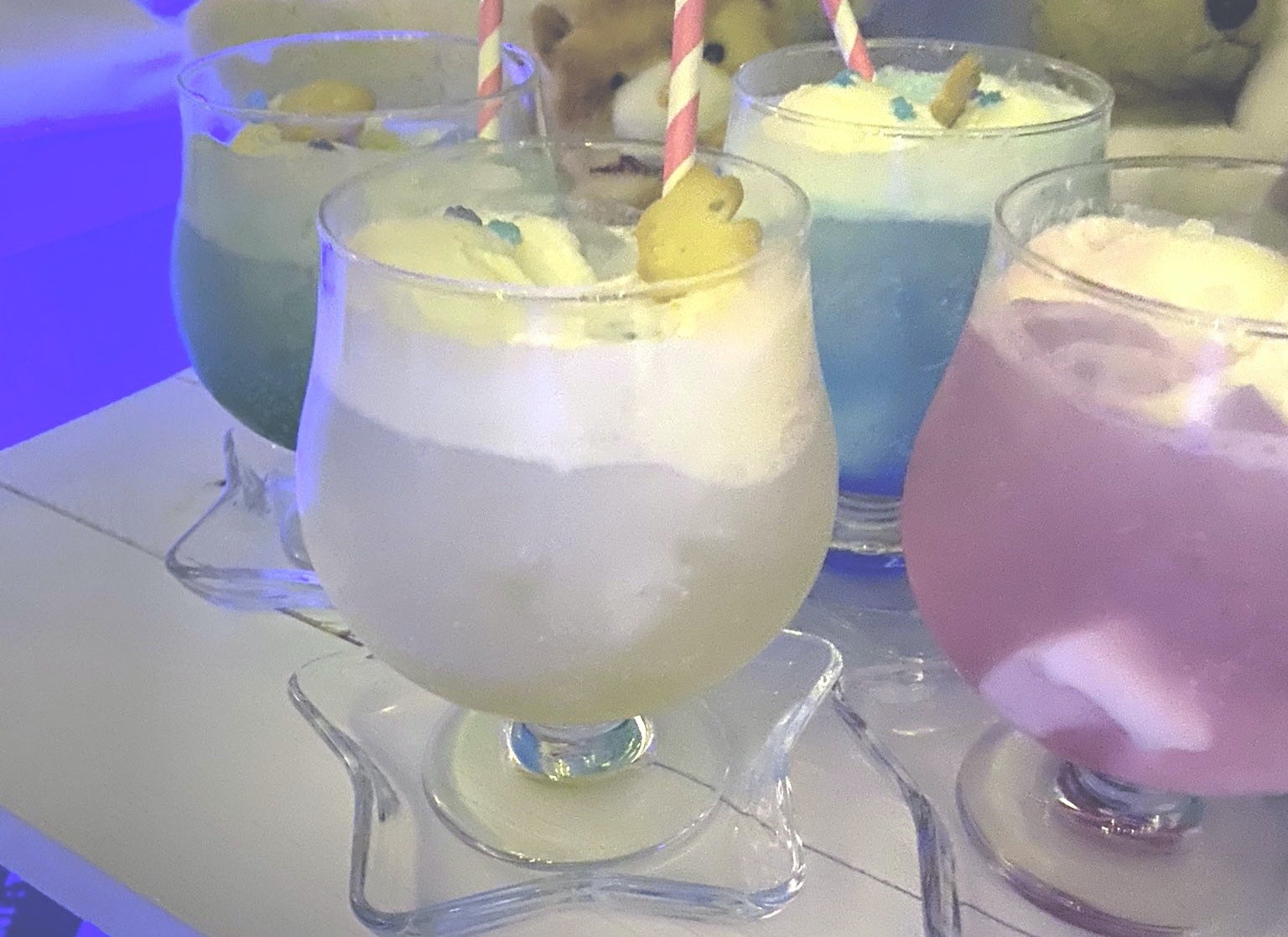 クリームソーダは惑星色(水色)・β星色(緑色)・流れ星色(黄色)・夢雲色(ピンク)の4種類と見た目も名前もかわいいバリエーションとなっており、味もそれぞれ違うので是非にゃむいので体感してみてください。ちなみにプラス料金でアルコール変更のおませなクリームソーダにもできちゃいます。