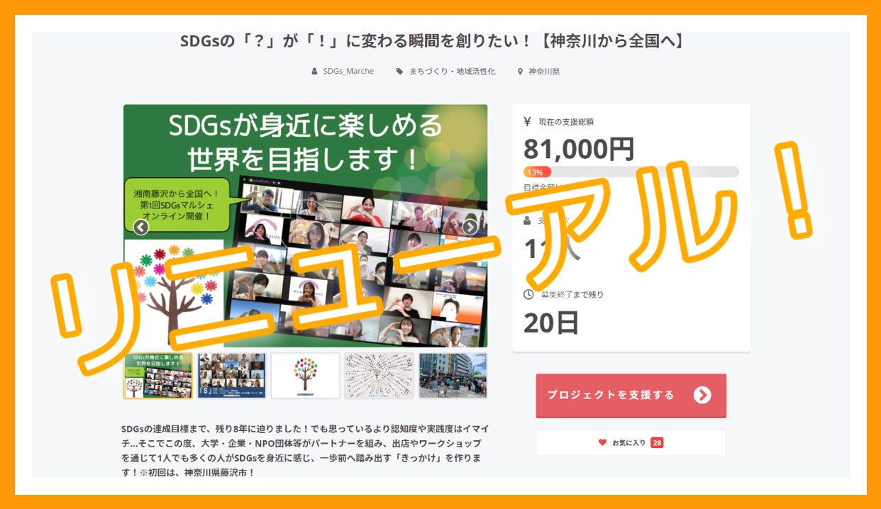 皆様こんにちは。本日より本プロジェクトページがリニューアルしました!タイトル画像や第1回SDGsマルシェ当日の動画も新しく盛り込みました★さらに!今回必見なのが、新しく追加されたリターンメニューです!※新しく追加されたリターンについては、次回の活動報告でご案内いたします。皆様、リニューアルしてさらに勢いのあるこのプロジェクトページを、ぜひ沢山の方へシェアお願いいたします!本プロジェクトをシェアする際は、下記リンクをお使いいただけます。https://camp-fire.jp/projects/view/443495