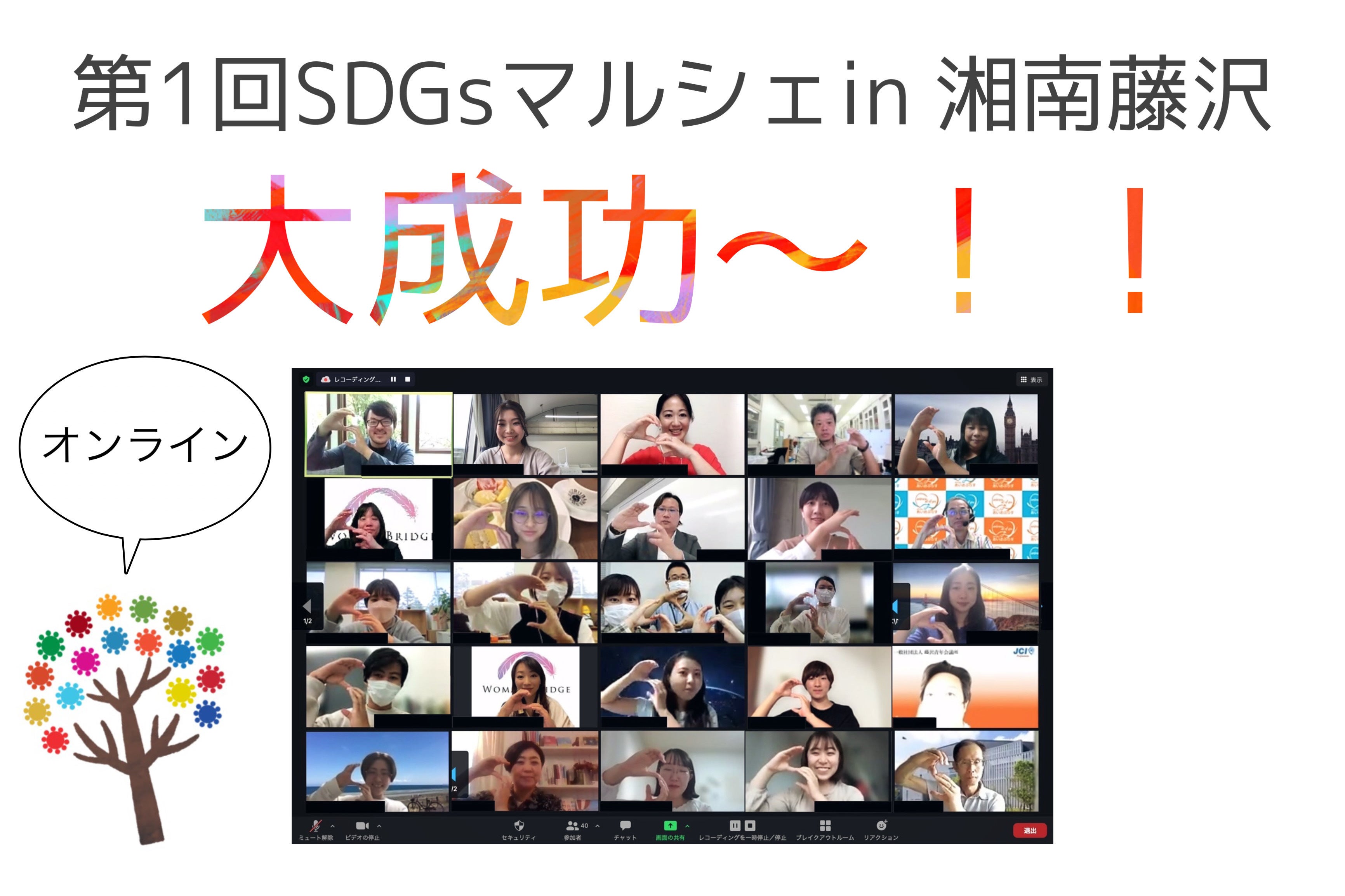 前回の活動報告では、午前の部のプチ情報を楽しんでいただけたでしょうか♪今日は続きの午後の部について、「当日参加できなかったけど内容を知りたい」「興味はあるけど実際に何をしているんだろう」と感じている方に、イベント当日の最新情報をご紹介します。【当日のスケジュール ※一部時間変更あり】~お昼休憩~13:00~ (一社) Woman-Bridge湘南(1)13:24~ (一社) Woman-Bridge湘南(2)13:42~ 多摩大学思い出の服大変身14:00~ VitaSana14:18~ 慶應義塾大学CDP14:33~ 草木循環Labo14:45~ 藤沢市民活動推進機構15:05~ 閉会式(敬称略) ★午後の部★お昼休憩をはさみ、午後の部がスタート!午前に続き普段なかなか見ることが出来ない、地域に密着した活動をしているメンバーが多く、湘南藤沢ならではの情報が盛り沢山!多摩大学 思い出の服大変身は、事前に収録した動画を使って身近なTシャツからエコバッグにする方法をご紹介いただきました。参加者の中には実際に作成したエコバッグの写真を、イベント終盤にチャットでお送りいただいた方も!オンラインならではの楽しさに盛り上がりました!さらに、慶應義塾大学CDPのメンバーの普段地域に密着した活動を、スライドを通して身近に感じることが出来ました。質疑応答の際には、メンバー1人ひとりが自身の経験に基づいてSDGsや自身の活動に対するアツい想いを持っていることがさらに伝わりました!各団体・登壇者の活動を通して、SDGsだけでなく「湘南藤沢」についてもっと知りたくなりましたね!午前に続き、午後の部の充実した企画満載に、時間を忘れてしまう方も多かったのではないでしょうか★★閉会式★閉会式では今回ご参加いただいた日本大学 小島先生、多摩大学 韓先生、最後にSDGsマルシェ実行委員会を代表して一般社団法人Woman-Bridge湘南 藤岡さんに閉会の挨拶をしていただきました。~参加者との写真撮影をして、閉会式の幕が閉じる~「SDGsについてよく知らない」という方も、身近な生活や活動とSDGsの繋がりを楽しく知る、考えることができる。そして、実際に行動するきっかけにできた「第1回SDGsマルシェin湘南藤沢オンライン」でしたね!公式SNSでも最新情報が更新中!フォローお待ちしております♪Facebook: https://www.facebook.com/sdgs.shonan/ Instagram: https://www.instagram.com/sdgs_shonan/ また次回の活動報告でお会いしましょう。