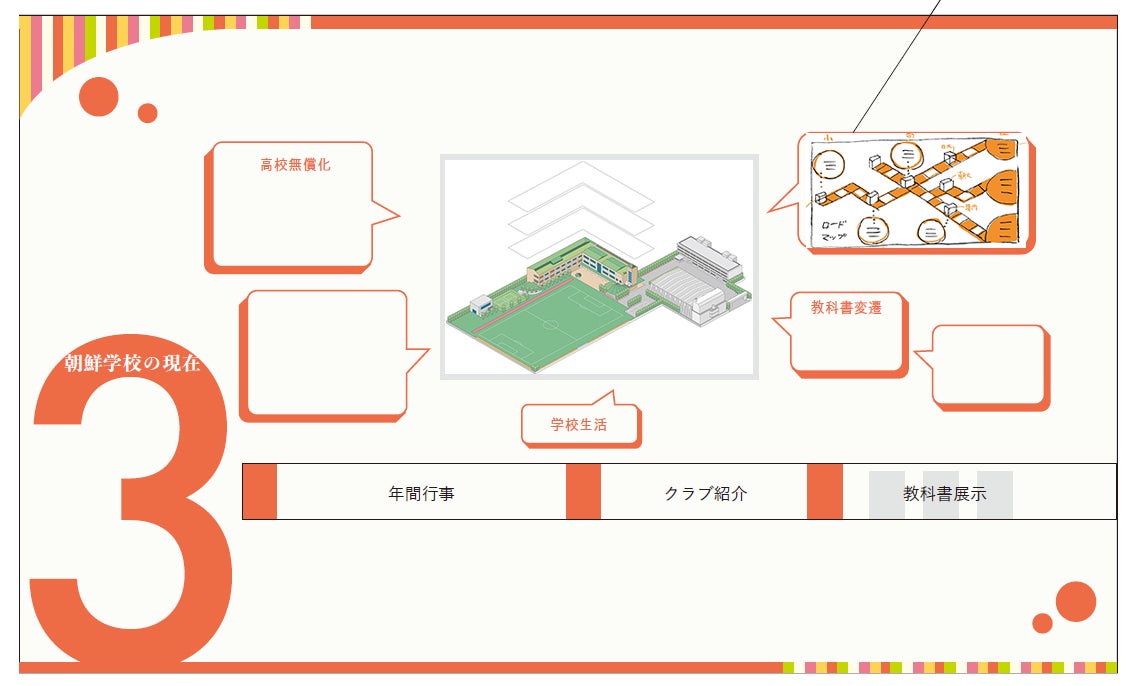 まずは、東京朝鮮中高級学校の校内マップを中心に、使用している教科書、地域住民との交流、部活や行事の紹介から学生の進路、そして朝鮮との関係まで、朝鮮学校のさまざまな取り組みや現状をご覧いただけます。