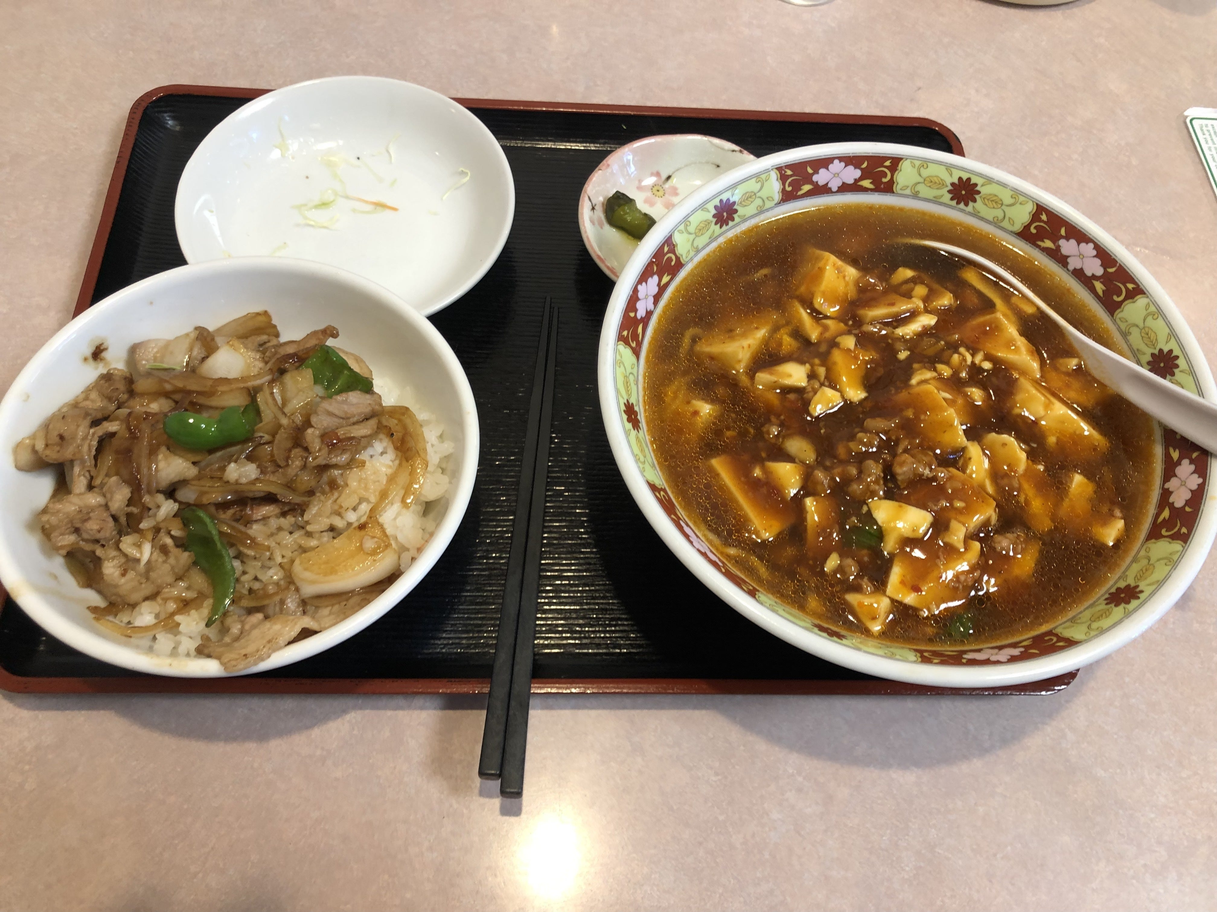 大好きな大吉飯店の豆腐丼+焼肉丼セット。(左上の小鉢はサラダですが食べちゃいました。。。)