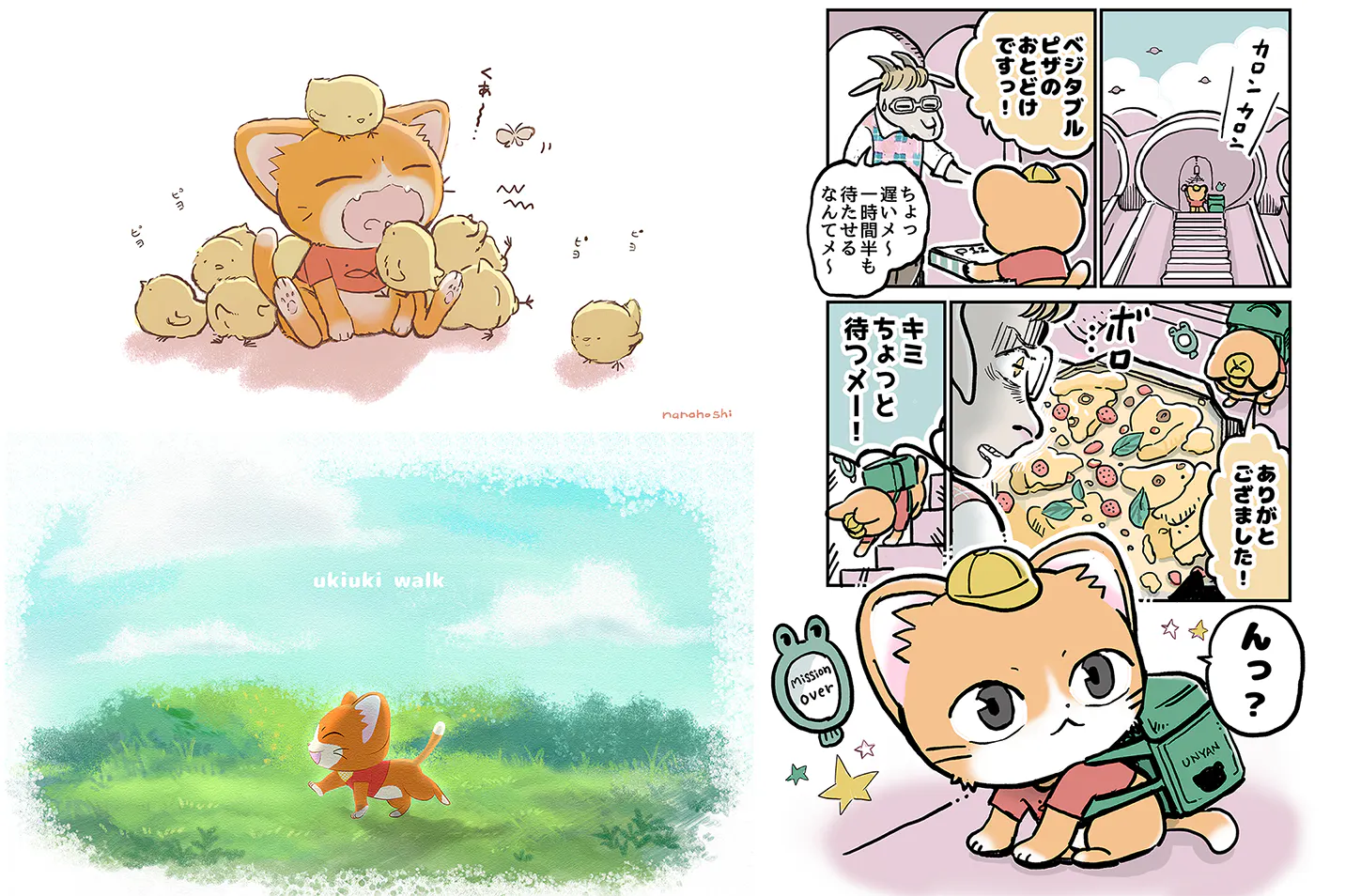 昨年のコロナ下で、見る人が元気が出たりホッとするような作品を作ろうと、無邪気な子猫の配達員『うーにゃん』のイラストや漫画をTwitterで描き始めました。