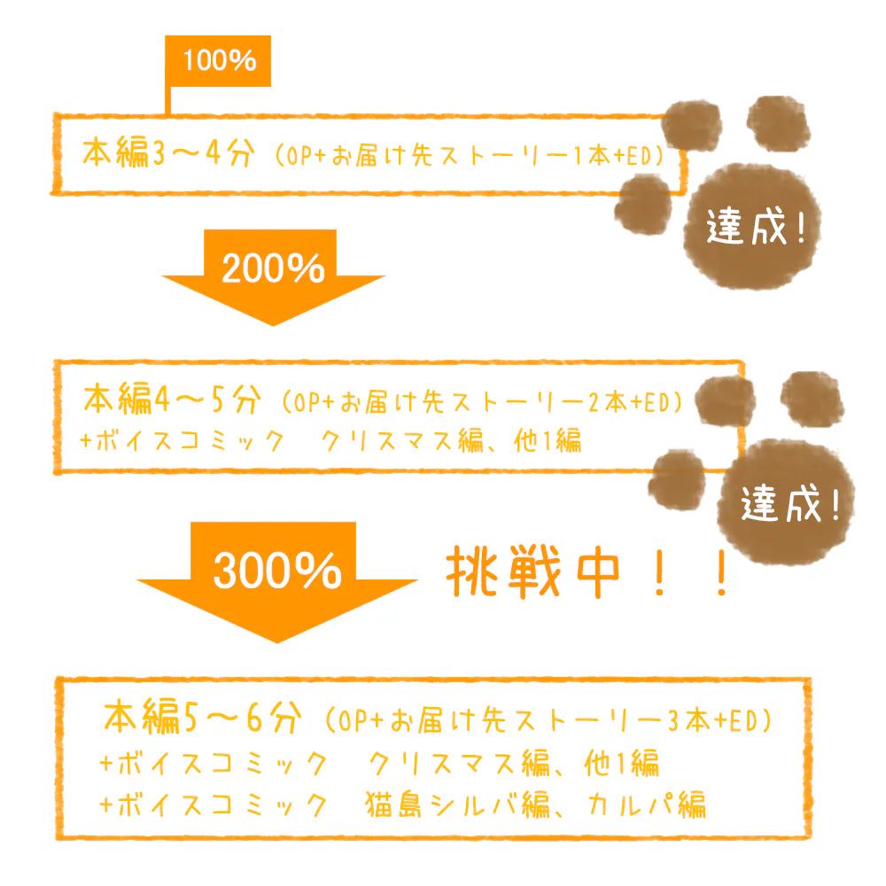 もし、100万円を超えた場合、集まった額に応じて本編の内容にサイドストーリーの追加や、本編とは別にうーにゃんの漫画を元にしたボイスコミックを作成する予定です。