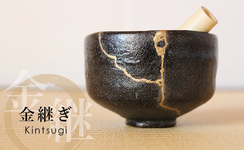 金継ぎとは、欠けたり割れたりした器を漆と金で修復する技術。