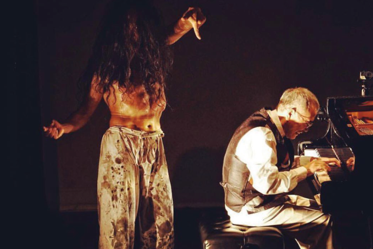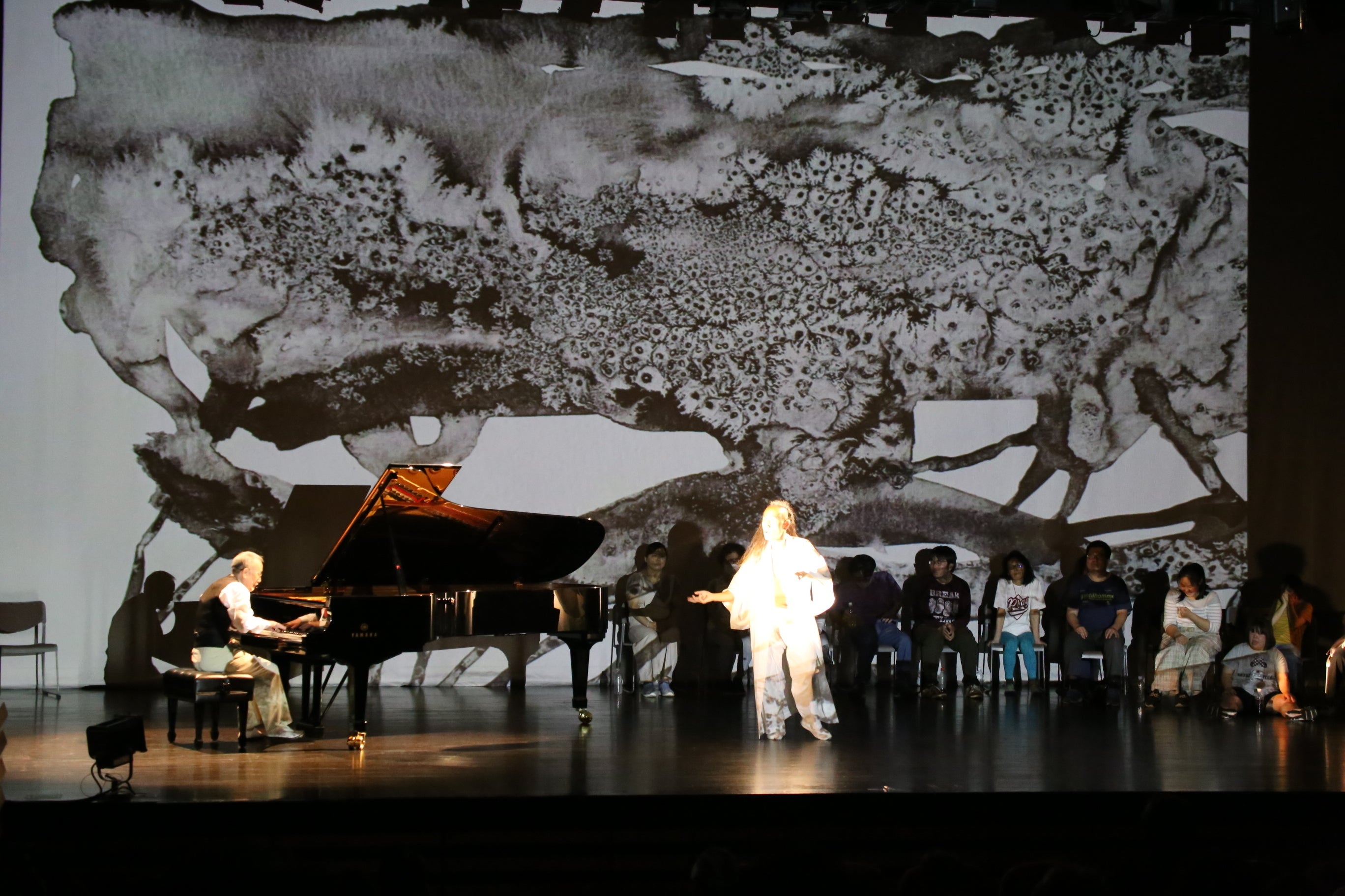 障害者と一緒にステージにあがったのは、なんと世界的ジャズピアニスト山下洋輔さんと、数々の芸術受賞歴もある肉態表現家、戸松美貴博さん。