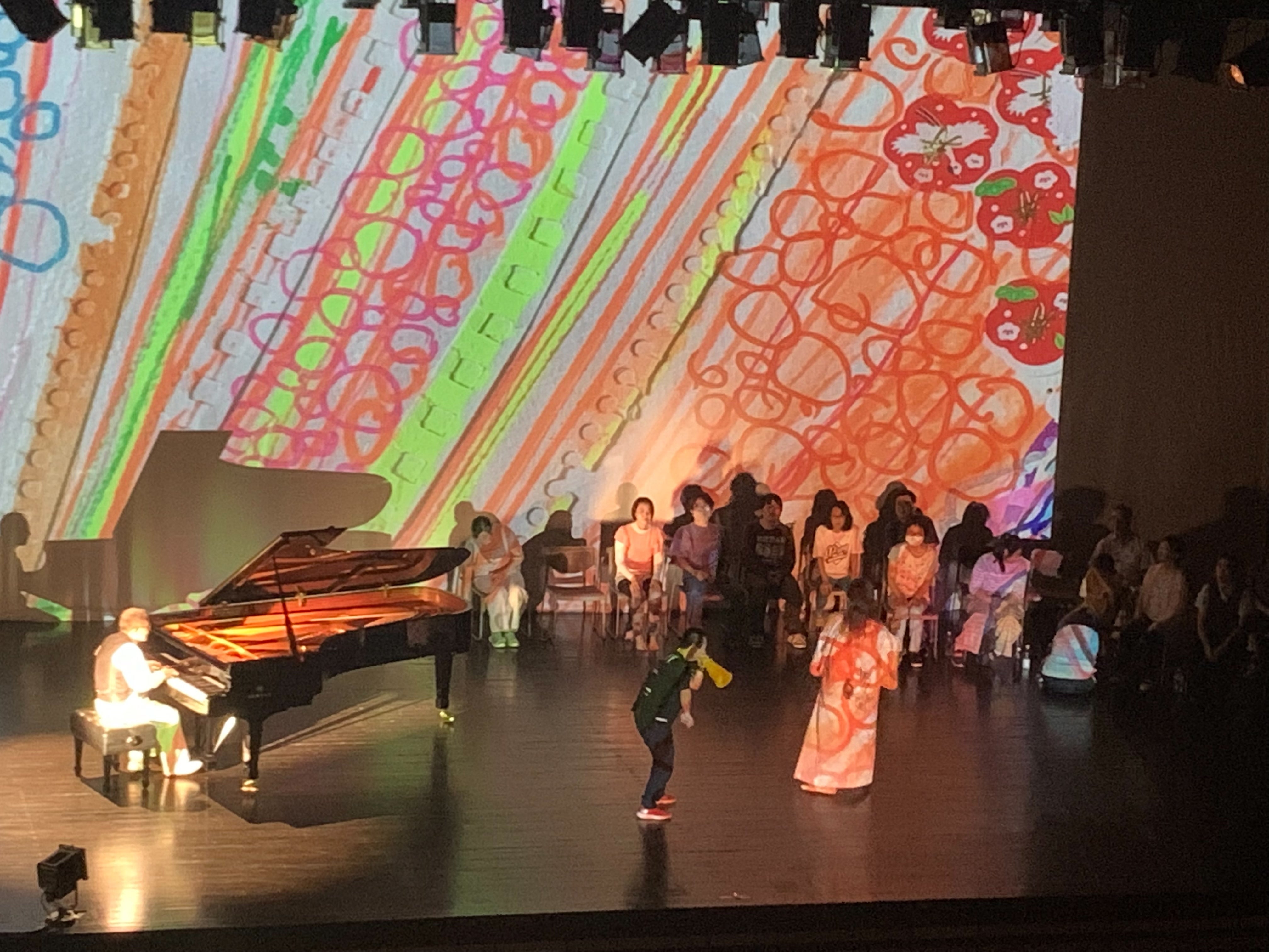 世界的ジャズピアニスト山下洋輔氏の生演奏が聴けると知り、杉田劇場まで1時間以上車を運転して訪れた。舞台上には、鍛え上げられた肉体を持つ男がマスクを投げ払い、女性の鳴き声とピアノの音が響いた。その一瞬で私は「ああ、やっぱり」と何かを納得した感覚に陥った。薄々わかっていても何処かで期待していたのだろう、なんか一曲くらいは弾いてくれるのでは?と。ピアーズとの競演で即興なのにそんなことが起こるはずない。世界的ジャズピアニスト山下洋輔氏の生演奏で精神障害のある方達が元気に大合唱?そんなことはやるわけがない。わかっていたのに期待もしていたらしい、そして最初の一瞬で「ああ、やっぱり。この先何が起こるのか1ミリもわからない」と覚悟を決めた。踊る人叫ぶ人舞う人跳ねる人水を飲む人笑う人様々な表現が入り乱れる時間が展開される。どこからどこまでが予定されていて、狙われていることなのか全くわからない。即興と言えども、事前にワークショップなどを複数回やったと聞いている。何かしらの準備があったのではないのか?時々雰囲気を変えてくる照明バックのスクリーンに映し出される様々なアートや言語確実に場面は切り替わっていく、物語が進んでいく、しかしその継ぎ目は見当たらない。とてつもなくスペクトラムだ。何なんだコレは?処理できないほどの疑問が湧き、さらに押し寄せる暴力的とも言える情報量。女性の鳴き声が止まらない。いつしか聞こえてくる規則的なヒューマンビートボックス、馴染みのある8ビートに少し安堵を覚える。しかしそこに乗るわけでもなく椅子に座り始める演者たち。休憩しているようにも見えなくもない。コレは一体なんだ?これまで使ったことの無いレベルの想像力を発揮しながら舞台から一瞬も目が離せない。終始ピアノの演奏が行われている。弾いているのは山下洋輔氏だ、そんなことはどうでもいいのではないか?という気がしてくる。いずれにしろ何を感じて何を思い奏でているのか全くわからない。本気なのか?手抜きなのか?何処かで聞いたことのある歌声が突然聞こえてきた。KP代表の藤井哲也氏が十八番のアノ曲を歌い始めている。ピアノは伴奏をしていない、全く関係のない事を弾いている。しかし関係あるのか?舞台上にいる人たちにはリンクする何かがあるのか?私にだけわからないのか?と不安にも襲われる。これは成立しているのか?リラックスとは真逆の時間が1時間以上超えた、会場は沸いているのか冷えているのか?それすらもわからない。個が舞台と向き合い、そして己と向き合う時間のように思える。即興が終わった後、山下洋輔氏が舞台を去った。残ったピアーズ達のスピーチは馴染みのある温度で安心が戻ってきたような感覚だった。会場からも笑いや拍手が聞こえてくる。あの即興の時間は何だったのか?今でも何一つわからない。何故こんなことが実現できたのか?詳しくは知らない。たった1つ私の中ではっきりしていることがあるとすれば、それは恐ろしいことに「もう一度見たい」と思っていると言うことだ。しかし2度と同じ事はおこなわれない、再現する事は不可能なのだ。それが生演奏であり、即興だからだ。そういった意味では大変貴重で価値の高い時間であったと言っても良いのではないか。クラウドファンディングで映像の記録を限定的ではあるが公開する予定があるらしい。今回の私が目の当たりにした光景を、他者がその目で確かめる手段はいまのところそれしか無いようだ。
