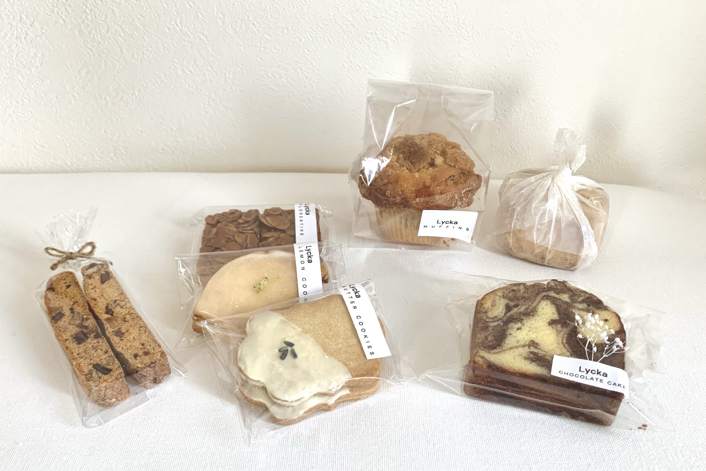 Lycka自慢の焼き菓子を6〜7種類詰め合わせてお届けします。