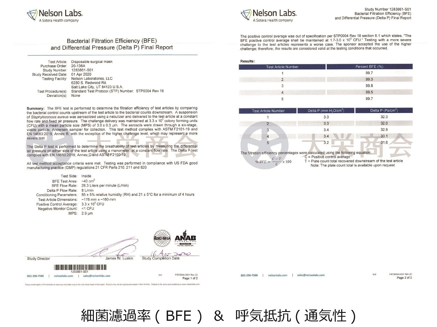 BFE : Bacterial Filtration Efficiency(バクテリア飛沫(細菌)捕集(ろ過)効率)