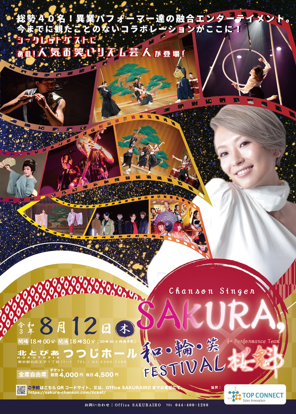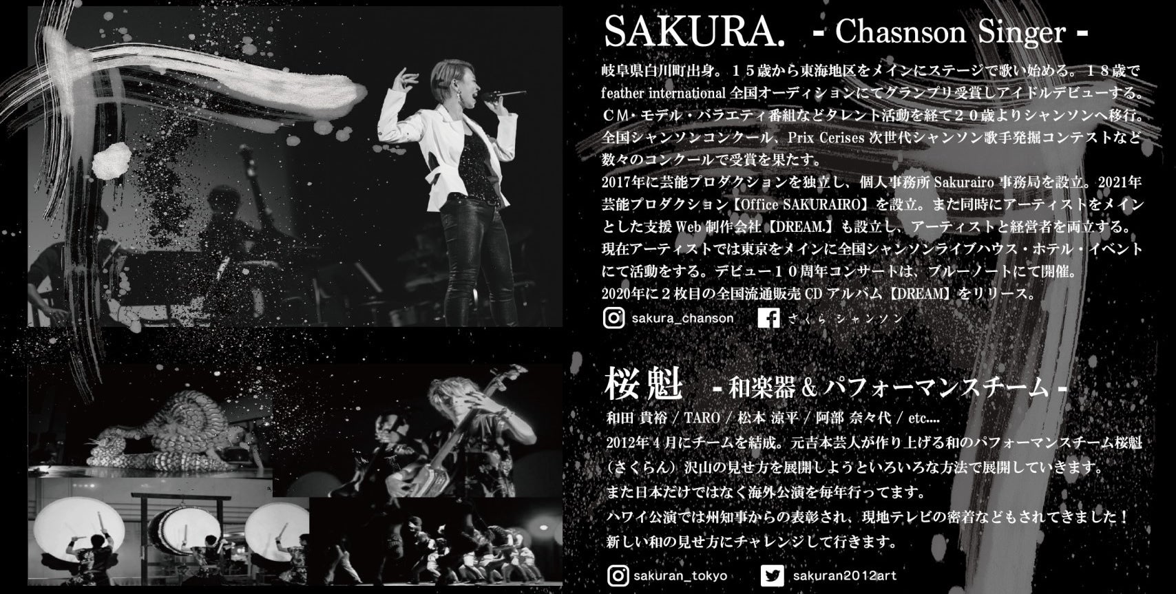 歌手SAKURA.は20歳でアイドルからシャンソンへ移行、その後、数々のシャンソンコンクールにて賞を受賞し、デビュー10周年はブルーノートにてソロコンサートを開催するなど、少しずつ活躍の場を広げて参りました。