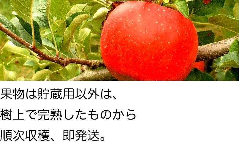 10月中旬~ 収穫開始 ※「盛造の木」 の林檎は一斉に収穫せず、実り具合を一つ一つ目で確かめて収穫するため、収穫時期に最大1ヵ月ほどの差が生じます。