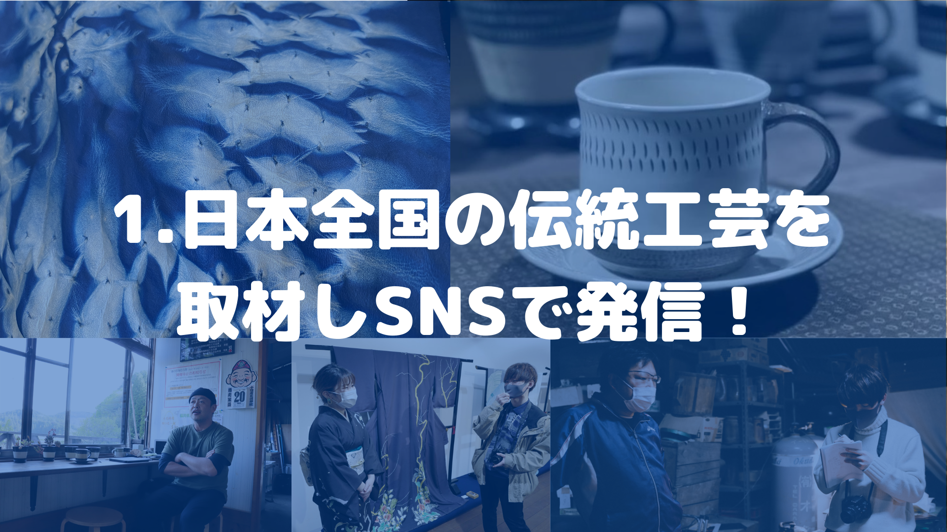 若者の目線で伝統工芸の思想の深さや魅力を発信すると同時に、学生自身も伝統工芸への理解を深め後世に継承する目的があります。具体的には、伝統工芸のwebメディアやSNS、その他イベントを行います。