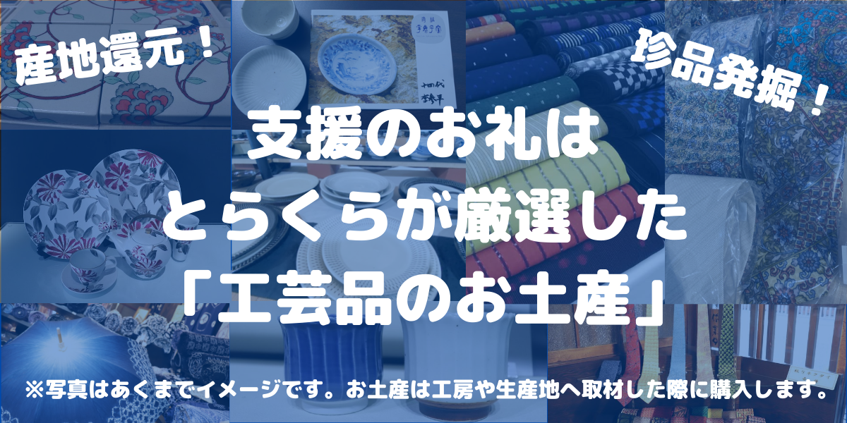 リターンは生産地にメンバーが取材した際に惚れた工芸品を代理購入し、お土産として皆様へお届けします。普段オンラインショップで出回っていないものや限定品を厳選します。