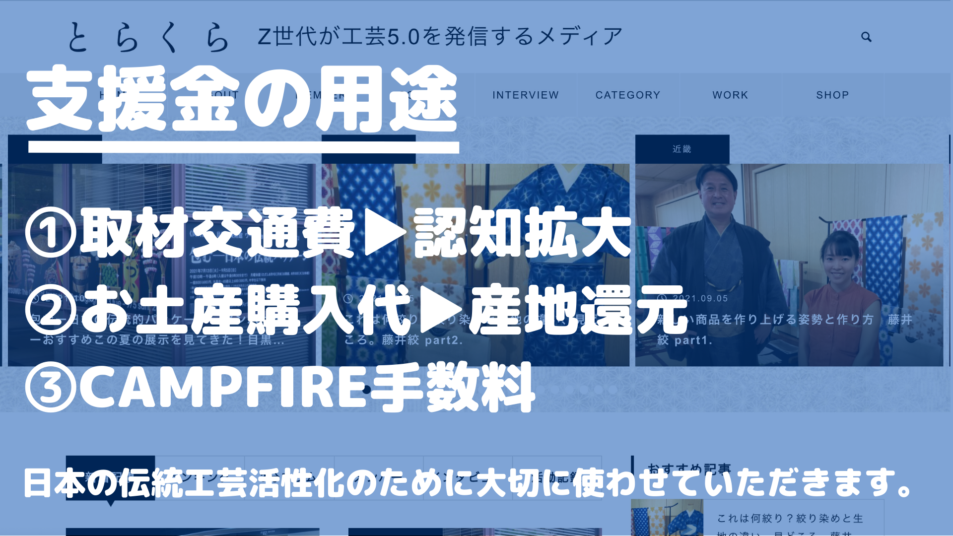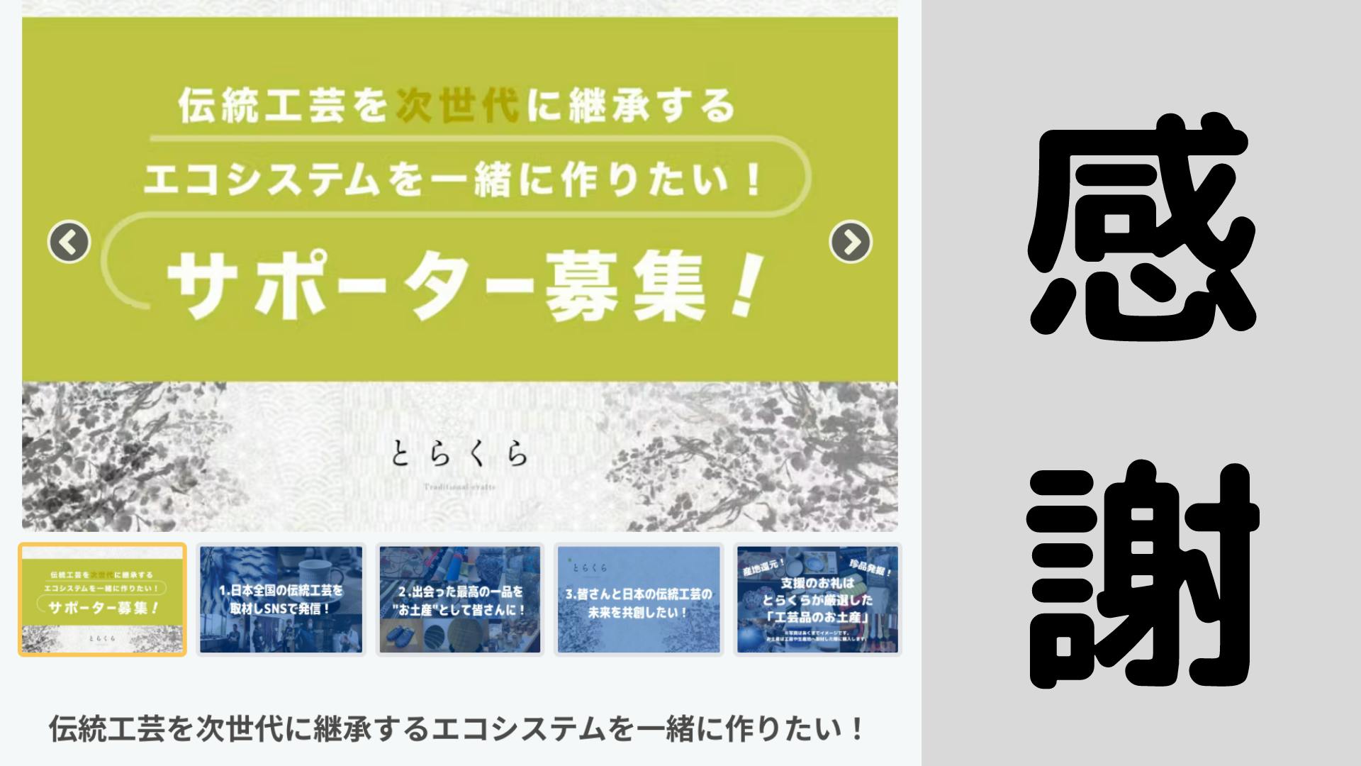 2022/02/06 19:53【プロジェクト終了のご報告とお礼】2022年2月5日 23時59分をもって、クラウドファンディングが終了いたしました。23名、536,111円ものご支援をいただきました。誠にありがとうございました!!寄付での応援だけでなく、SNSでの拡散や応援メッセージを多くいただき、本当に励みになりました。ありがとうございました!!伝統工芸学生アンバサダーとらくらは1月26日をもって2年目を迎えました。1年目は運営体制の整備や幅広い活動に挑戦しました。2年目はより運営体制も明確になり、活動もより活発にできると思います。webメディア torakura.com を軸とした情報発信と外部の企業とのコラボを通して、より多くの方に自分たちの等身大の「好き」を伝える活動を展開していきます。今後もぜひ伝統工芸への関心と、私たちへの応援をいただけると嬉しいです。本当にありがとうございました!今後もよろしくお願いいたします!!伝統工芸学生アンバサダーとらくら代表 白江 もっと見る