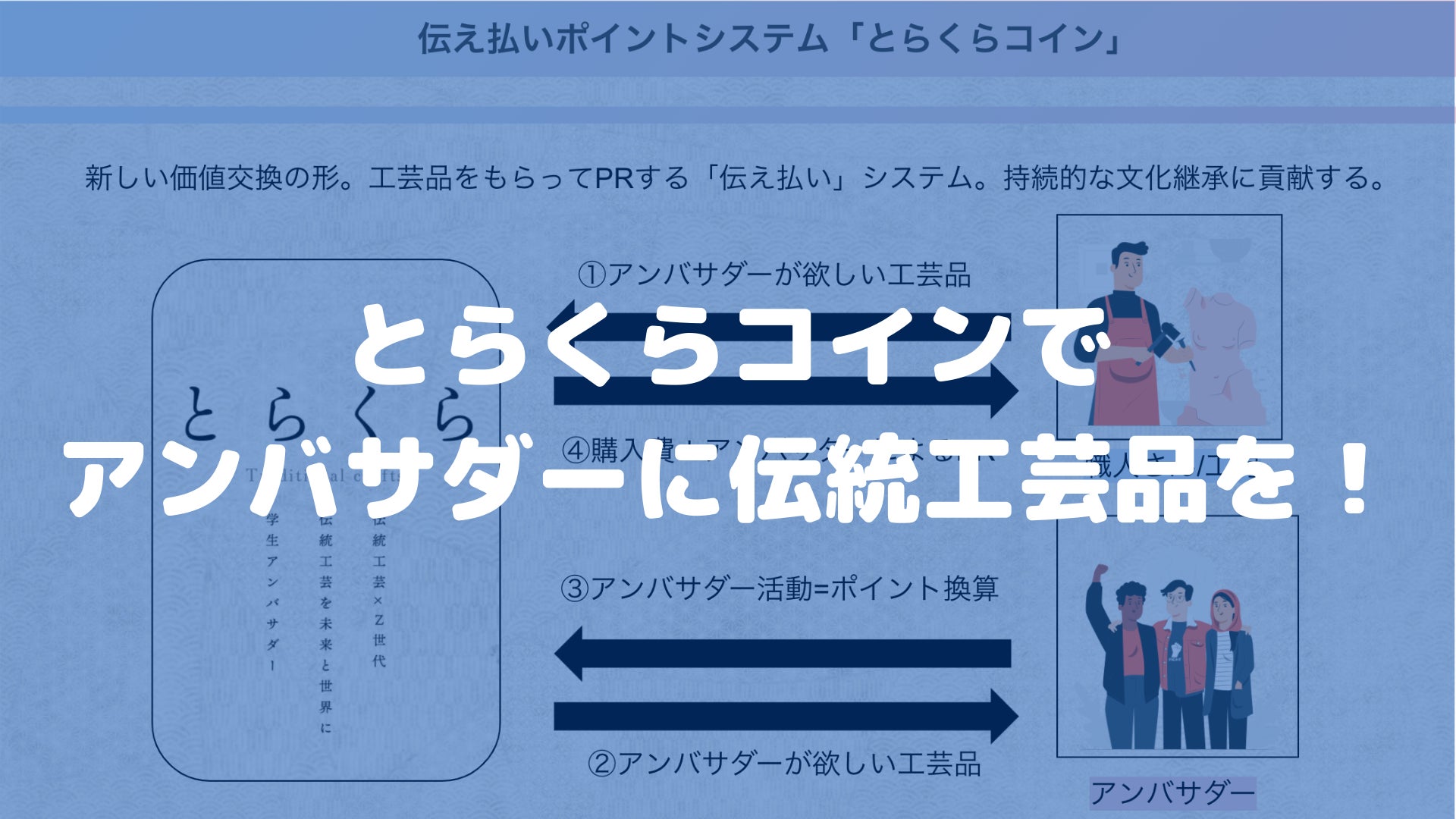とらくらではコミュニティの持続性を高めるために、伝え払いポイントとらくらコインを発行しています。アンバサダーの頑張りに正当なリターンを用意すること、リターンはさらに伝統工芸の業界へとプラスになること、を軸に考えこのシステムを構築しました。