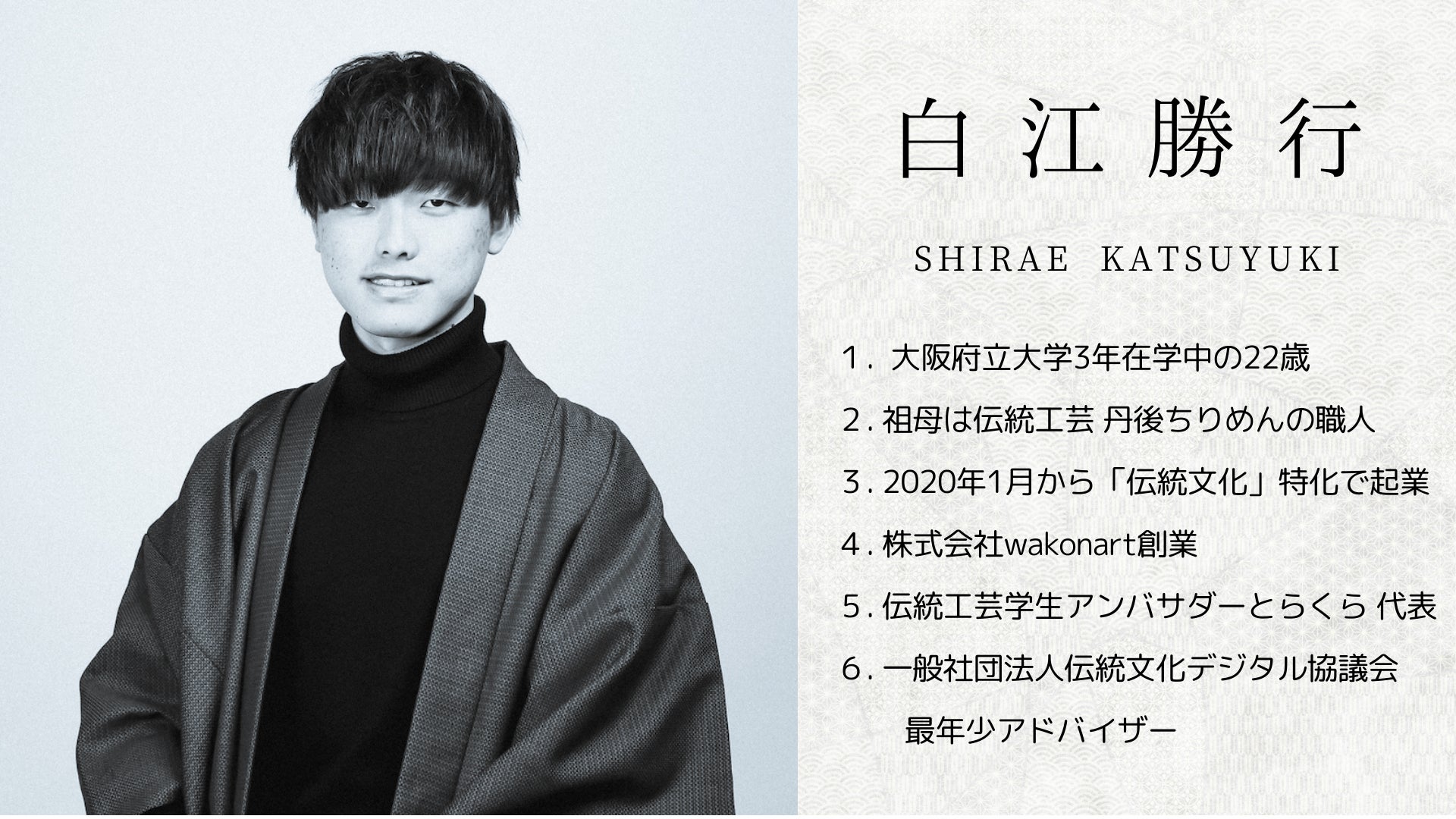 初めまして、伝統工芸学生アンバサダーとらくら代表の白江勝行と申します。私は現在、大阪府立大学3年を休学して「伝統工芸を未来と世界に繋ぐ」ために、会社や学生団体を運営しています。