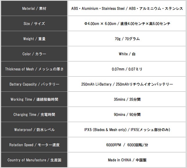 ・メッシュ、ブレード部分を水洗いした際には完全に乾燥させてから本体に装着して下さい。濡れたままの状態で装着すると故障の原因になる場合が御座います。