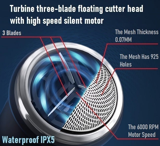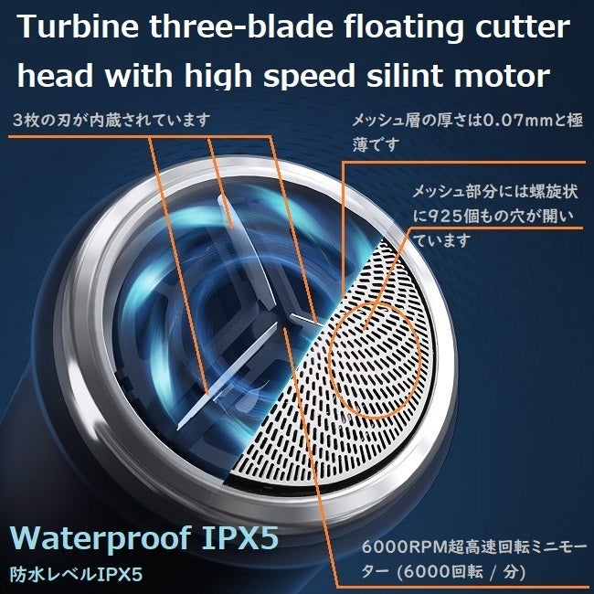 3. 三枚の刃が超高速回転 : 新たに開発されたミニモーターにより3枚の刃(ブレード)が6000RPM(6000回転/分)と超高速に回転するため、よりスピーディーなシェービングを可能にしました。