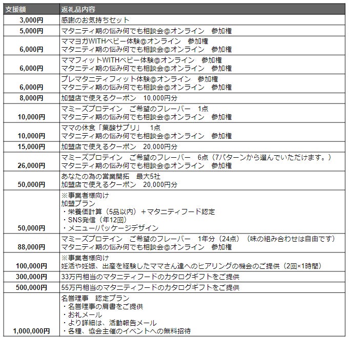 マタニティ期におすすめできる食品=マタニティフードとして認定されている商品や食事を扱っているお店で使えるクーポンなどの中から、ご支援金額+10%相当の商品の詰め合わせをご提供させていただきます。カタログギフトのように、商品のリストをお送りしますので、ご支援金額+10% 分ピックアップいただくようになります。