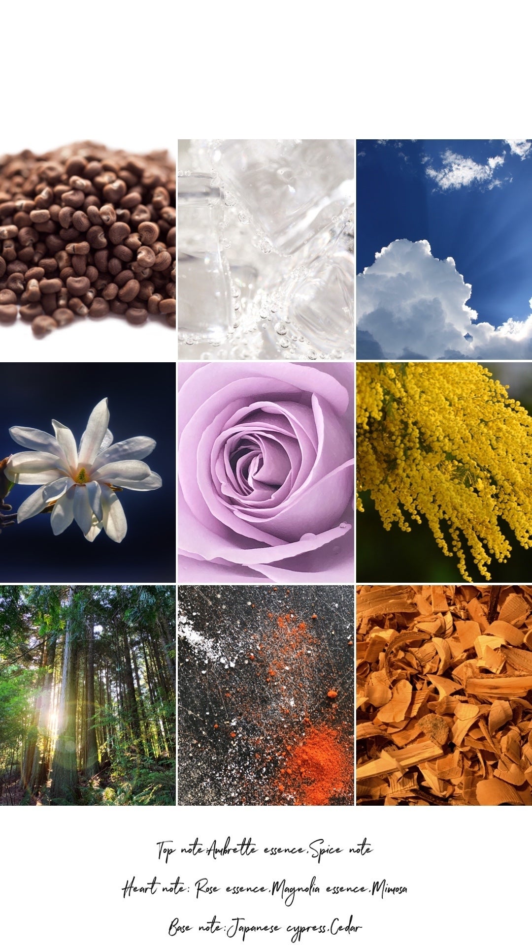 トップノートはアンブレットシードからはじまり、ミドルノートはミモザやローズがやわらかく香り、ラストノートは、落ち着いたシダーウッドやヒノキへと香りの曲調が変化します。とても軽やかなムスキーフローラルの香り。
