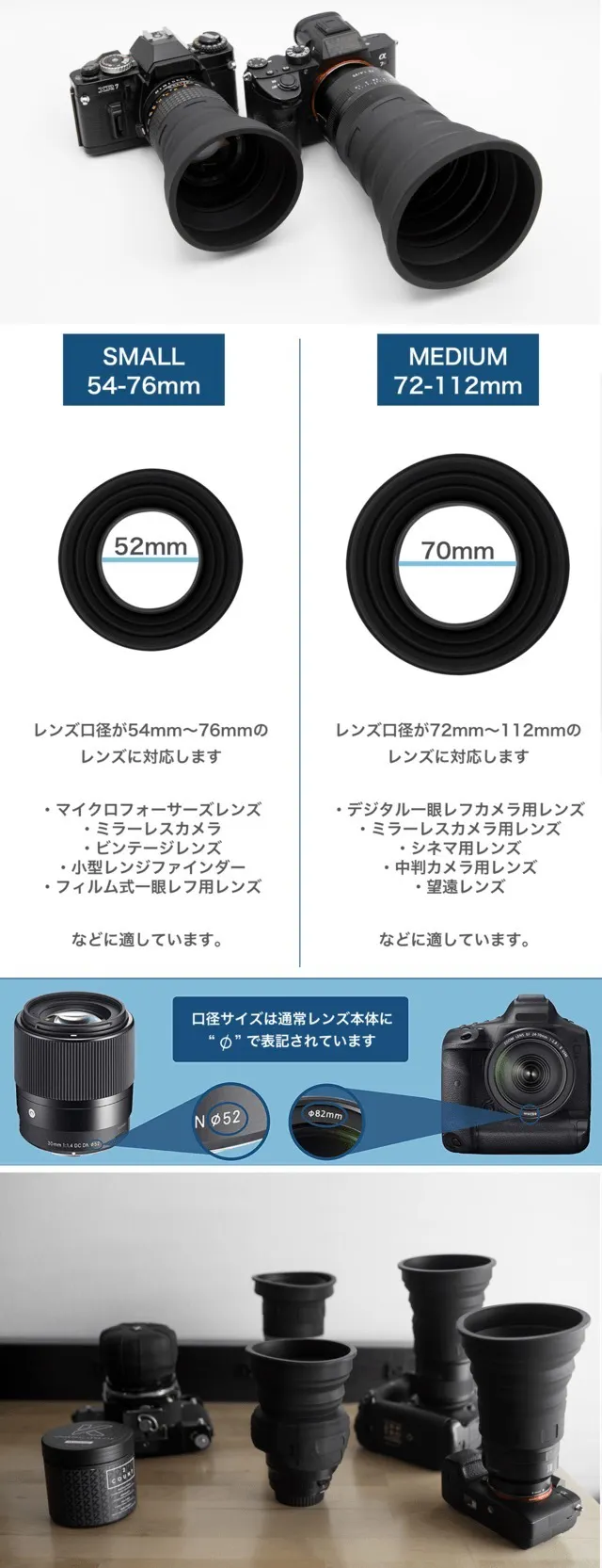 広角レンズなどによっては「ケラレ(四隅にフードの影が写ってしまう現象)」が発生することがありますが、その場合は折りたたんでご利用いただけます。