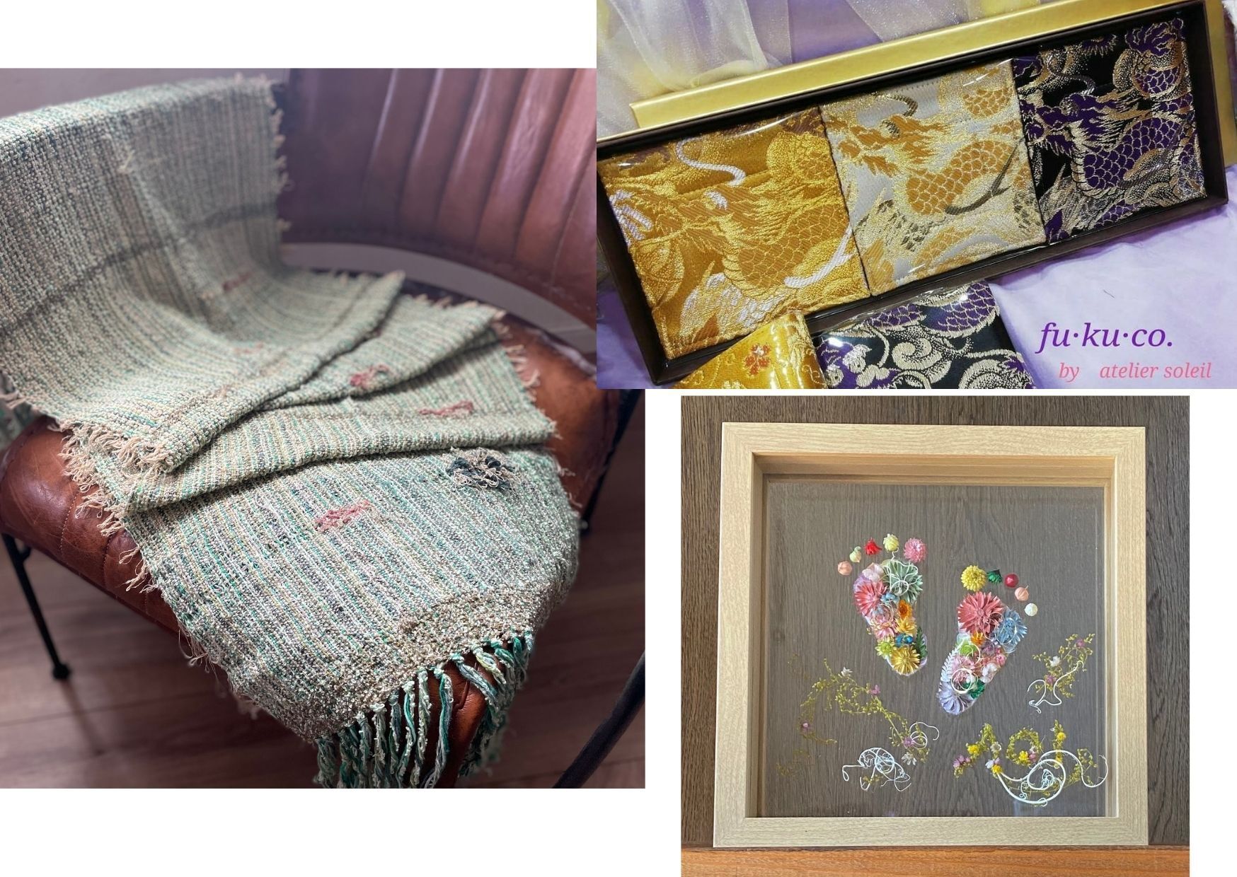 現在大阪の自宅アトリエを拠点に日本各地のイベント出店、オーダー受注、ワークショップなどとても精力的に活動されています。『atelier soleil』 という屋号で、金襴を使った煌びやかな小物類や御朱印帳製作、スイーツデコのワークショップなどとってもマルチなクリエイターさんです。 特に金襴を使った作品たちは開運グッズとしても大人気です!