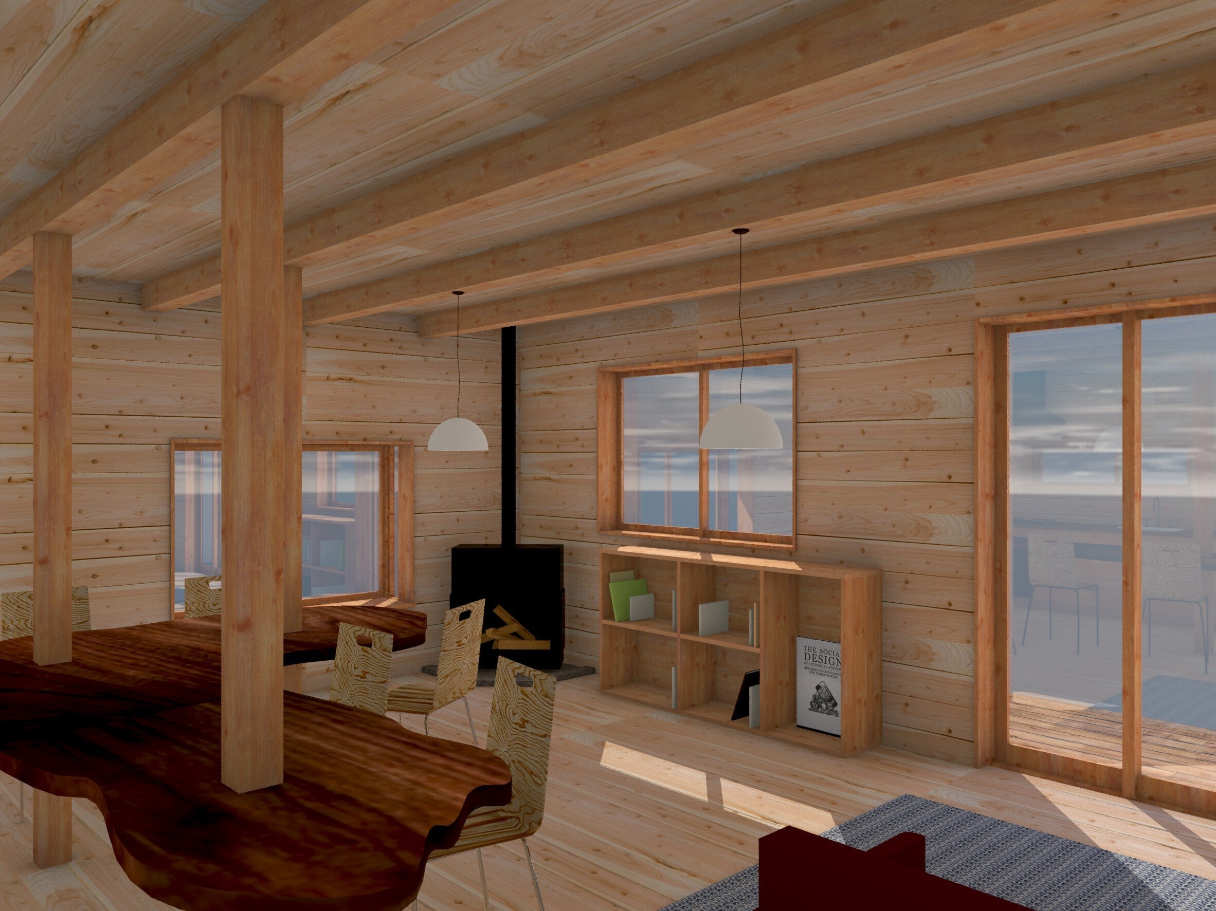 ウッディーな内装と薪ストーブ