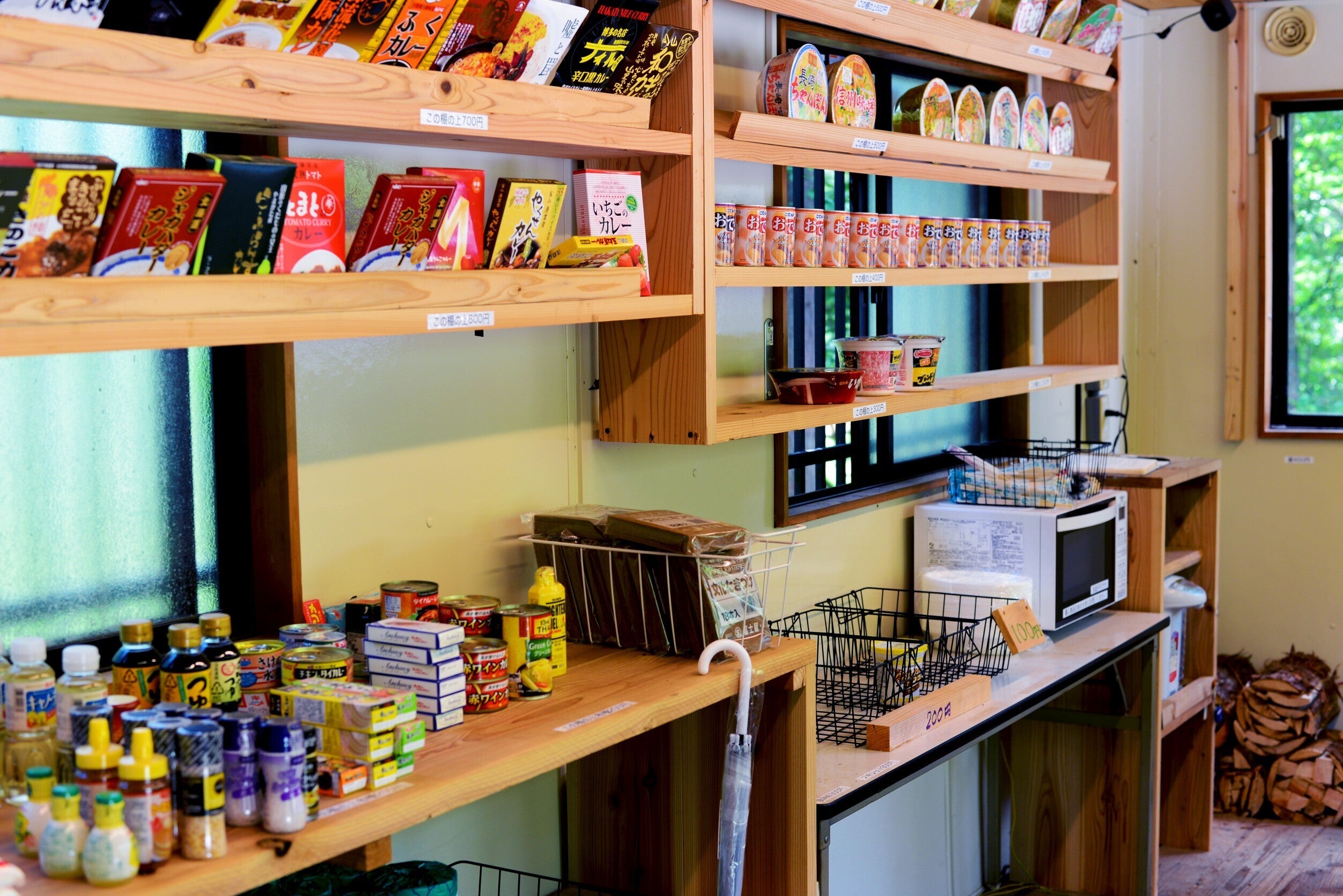 Wi-Fi、BBQセット、薪ストーブ、調理器具、食器、カトラリー、冷蔵庫、電子レンジ、トースター、洗濯機、ドライヤー、シャンプー、リンス、ボディーソープ、ハンドソープ、トイレットペーパー、布団、枕、シーツ、スリッパ、天体望遠鏡、ボードゲーム各種