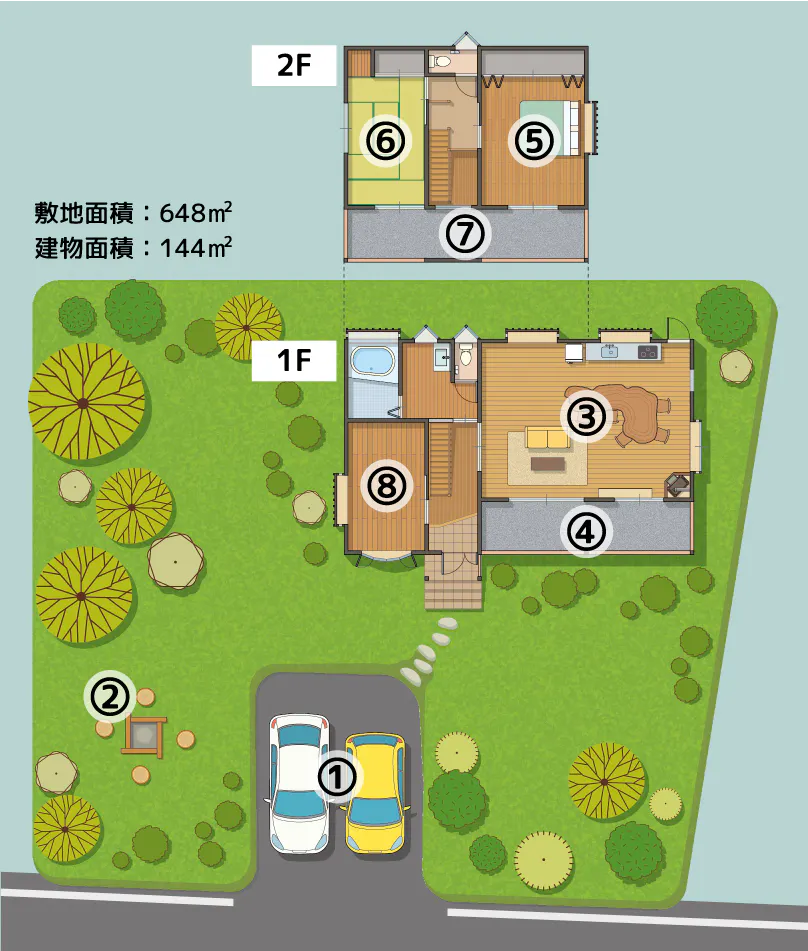 ①駐車場 2台駐車可 ※2台以上の場合はご相談ください。