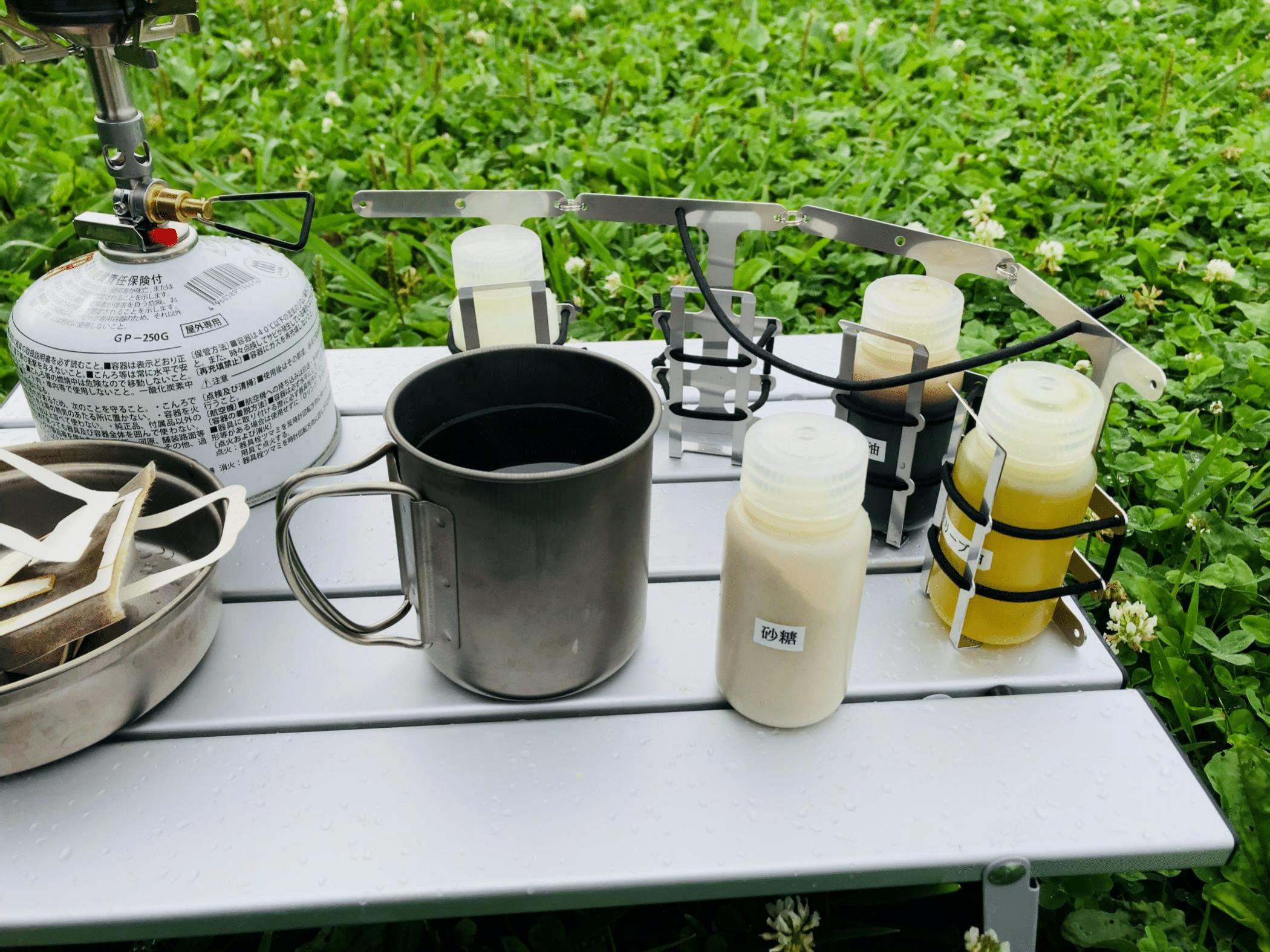 今回提案するシーズニングボトルホルダーは、SeriaやNalgenの60mlボトルに入れた調味料をすっきりと収納。さらに折りたたんでクッカーの中にすっぽりと収納します。シンプル構造で軽く見た目もクール。これでキャンプ場で料理を始める際にクッカーと共にさっと調味料を取り出せます。