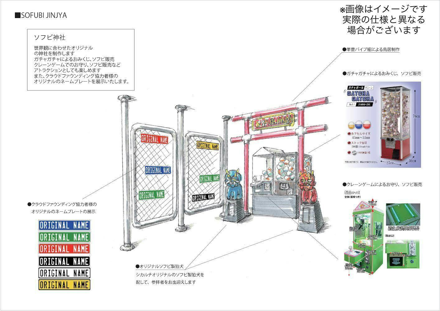 2021/08/15 00:04こんにちは。シカルナ・工房です。 ご支援ありがとうこざいます。 クラウドファンディングも残り10日となりましたが、コロナ禍の影響を受け、厳しい状況が続いています。なかなか思うように進んでいない状況ですが、ソフビ神社のイメージ図が完成しました。【ソフビ神社】世界観に合わせたオリジナル神社 !!!配管でできた鳥居の前には、ソフビの狛犬が参拝者をお出迎えします。ガチャガチャによるおみくじ、ソフビ販売クレーンゲームでのお守り等…アトラクションとしても楽しめます。また、クラウドファンディングにてご支援頂きました支援者様のオリジナルのネームプレートを展示致します。少しずつではありますが、オープンに向けて進捗しております。1日でも早くコロナが収束することを願って、頑張ってまいりたいと思います。引き続き、ご支援お願い致します。 もっと見る
