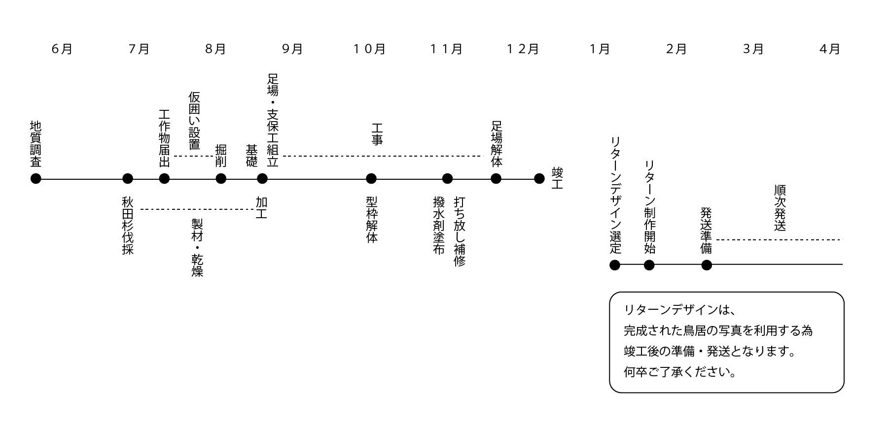 リターンの記念品に関しては鳥居の完成後に記念品のデザインを発注する事と、年末年始にかかりますので発送作業が難しいという状況ですので令和4年3~4月の発送を目指しております。何卒ご了承ください。