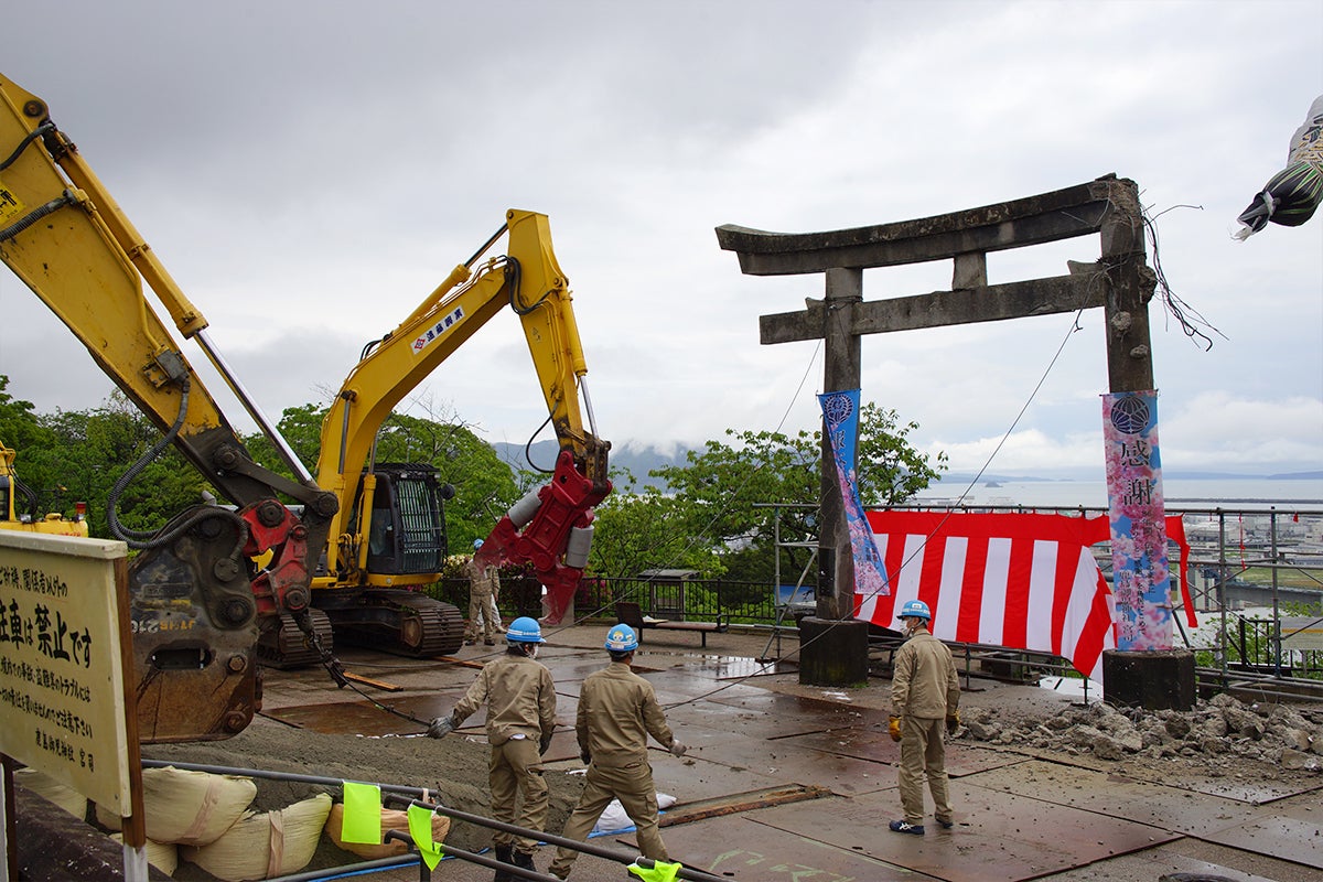 鹿島御児神社の大鳥居は度重なる地震や経年劣化により倒壊のおそれがあるということで解体せざるを得ない状況になり、2021年5月22日に地元の企業様ご協力のもと、解体いたしました。