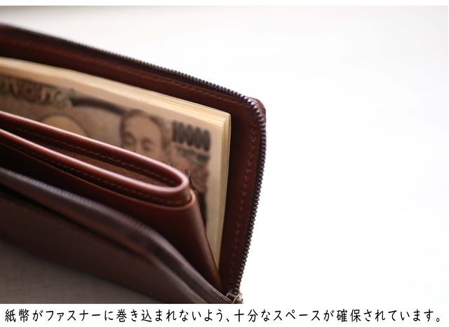 ※紙幣を収納される際は、奥までしっかりと収納してください。手前で止めてしまうとファスナーに巻き込まれてしまう可能性がございます。