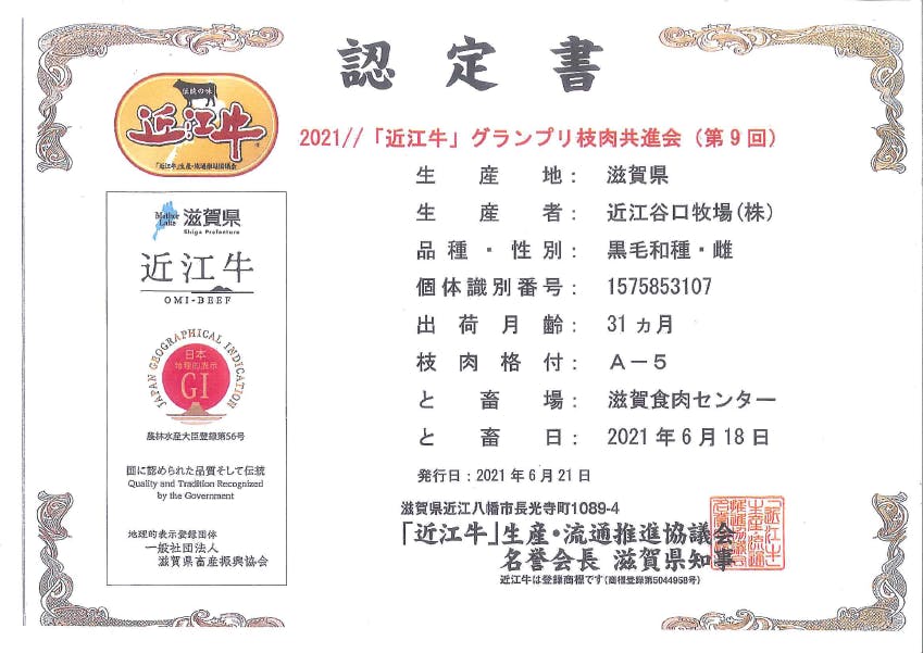 こういった農家の皆様の努力もあり、肉のげんさんは認定「近江牛」指定店となりました。近江牛の中でも特に品質の高い近江牛には認定書が発行されます。