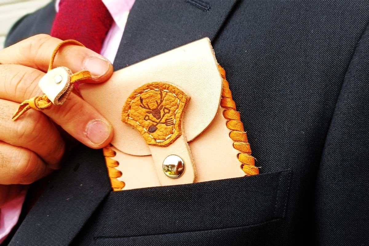現在ミニ財布が流行っていますが、どんなに小さくしても、革の本質だけは小さくしてはいけません。革だけではなく金具もこだわり、真鍮を使っていますので金具としての経年変化を楽しむことができます。ビジネスにも、カジュアルにもシーンを選ばない魅力的なミニ財布はハトメとという穴の開いた金具を付けたのでカラビナをつけてキャンプや登山でも能力を発揮します。優しいデザインは女性にも人気ですので夫婦や恋人同士で使うのも楽しいかもしれません。全てハンドメイドで手縫いで作り上げたので丈夫で一生モノとしてもお使いいただけます。表面には鹿の革を貼り付けました。職人が素材と向き合いながら一番いい表情を活かして作るため、ひとつひとつの表情が違います。