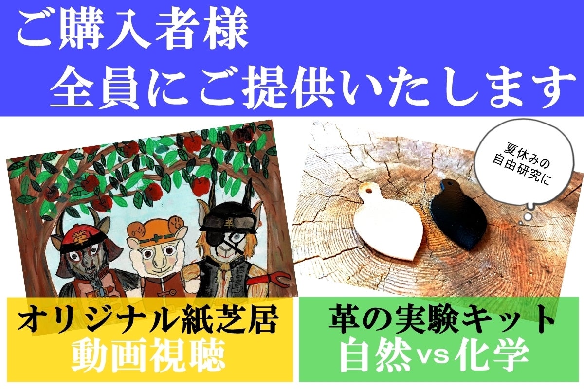 誰もがひとつは持っている革小物。しかしほとんどの人が革のことを詳しく知りません。革の特性を知ると共に、有害鳥獣被害という全国的な問題にもフォーカスして革のことを学べます。ご購入者全員に、革の実験キットとオリジナル紙芝居動画視聴の二つをご提供いたします。