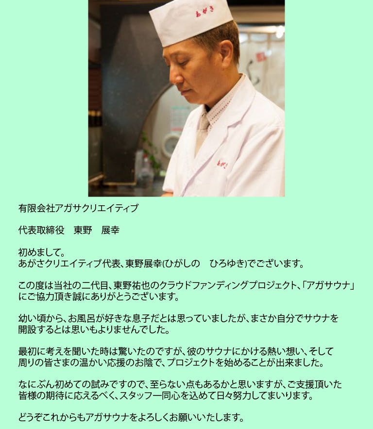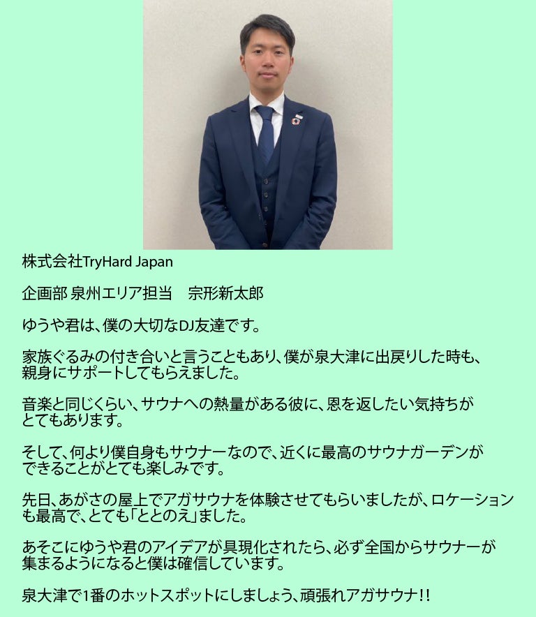 屋上から泉大津の街並を眺めながら、優雅にサウナを楽しめる空間でリラックスして頂き、そしてサウナで整い、五感が研ぎ澄まされた状態で、あがさ自慢のてっちり料理を召し上がって頂きたいと思っています。