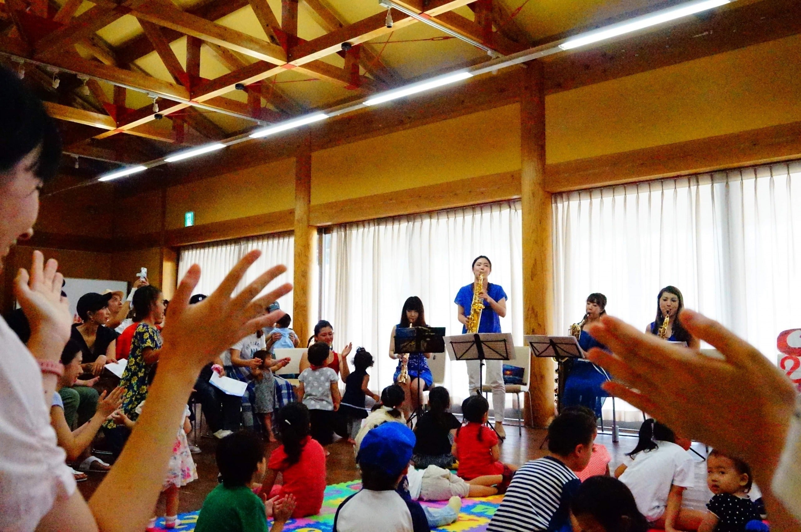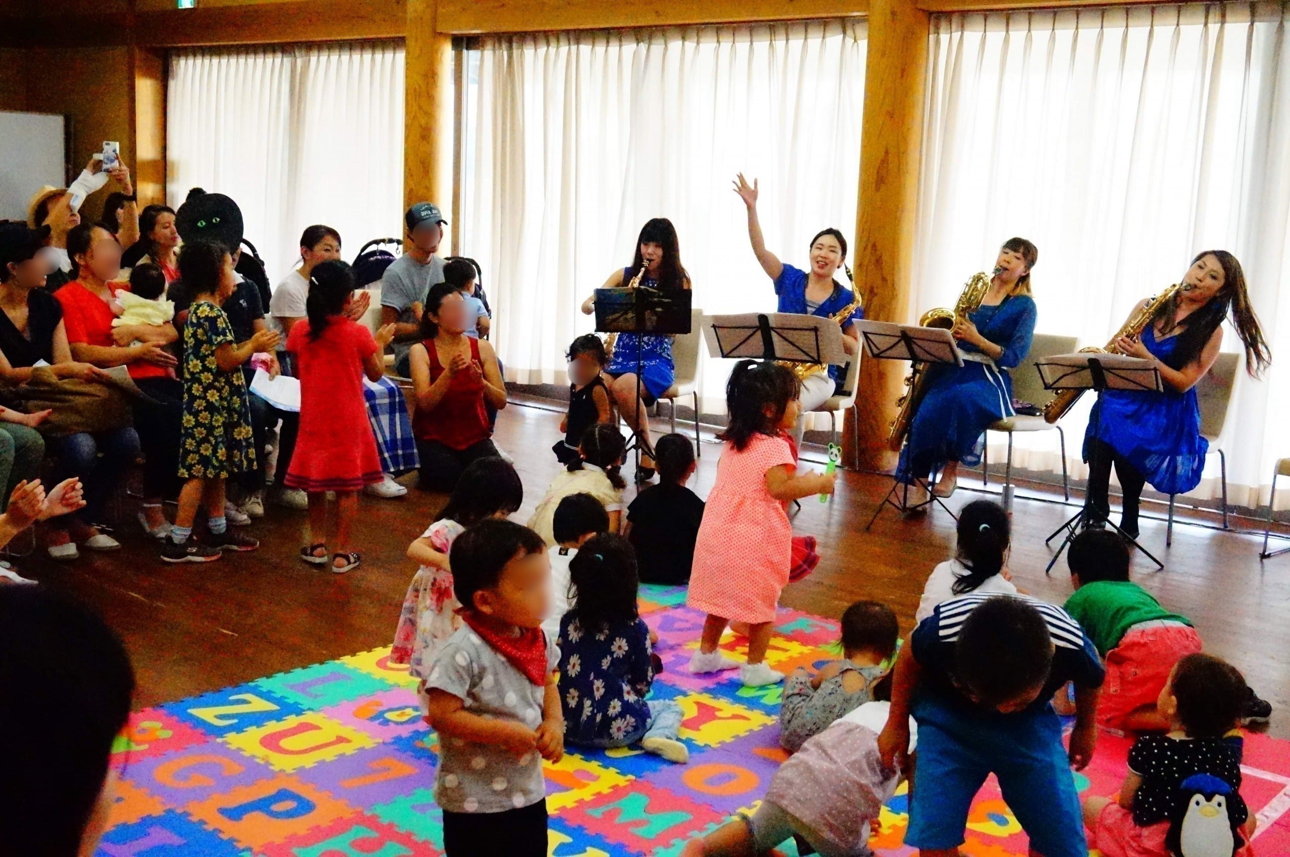 主に未就学児を対象としたリトミックを中心にしたコンサートで、ジョイントマットを敷いた中で、子どもたちが自由に動き回り、それを見守る親御さんたちの笑顔はとても輝いていました。