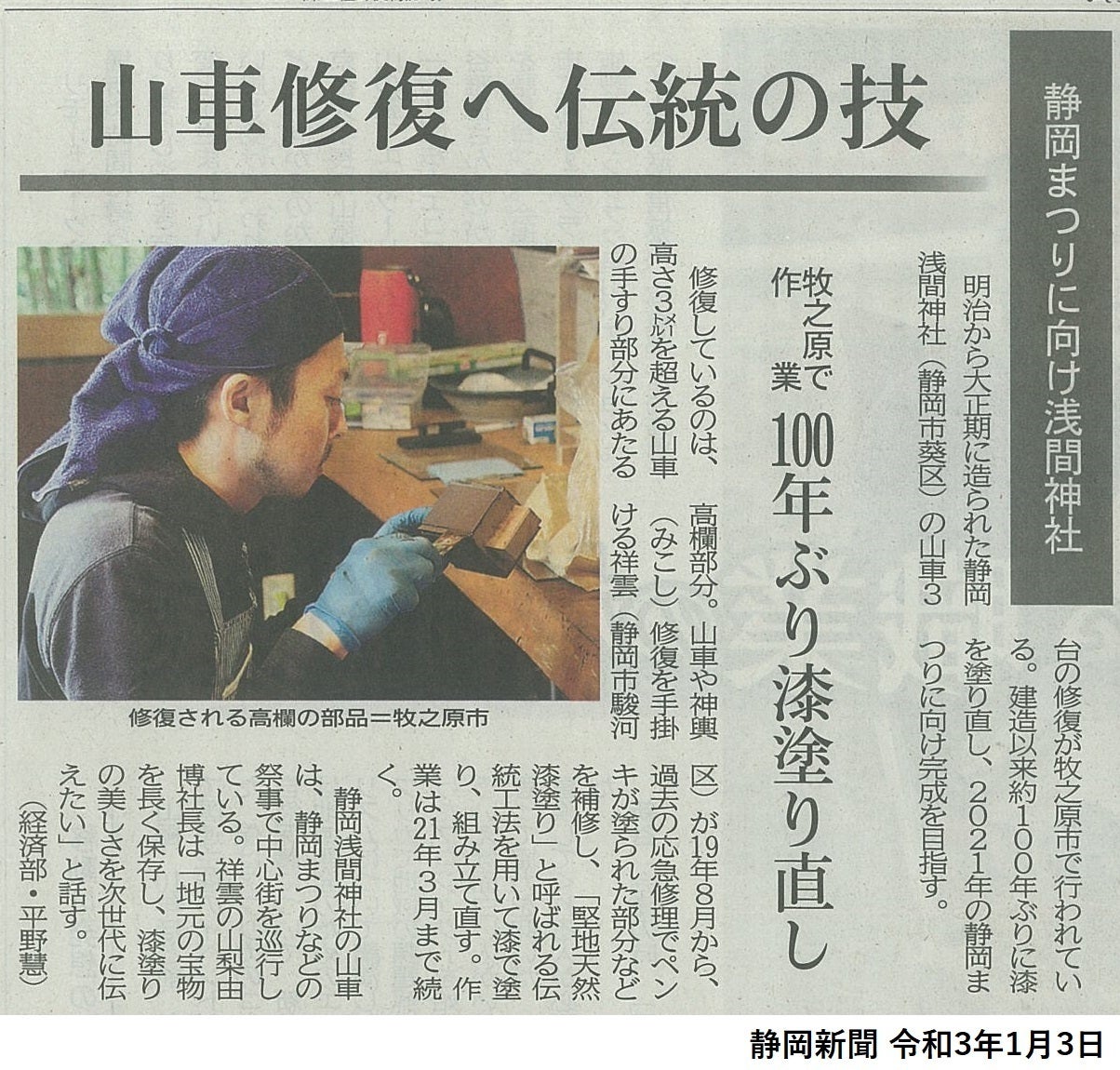 静岡市 静岡浅間神社の山車修復の仕事について取り上げていただきました。