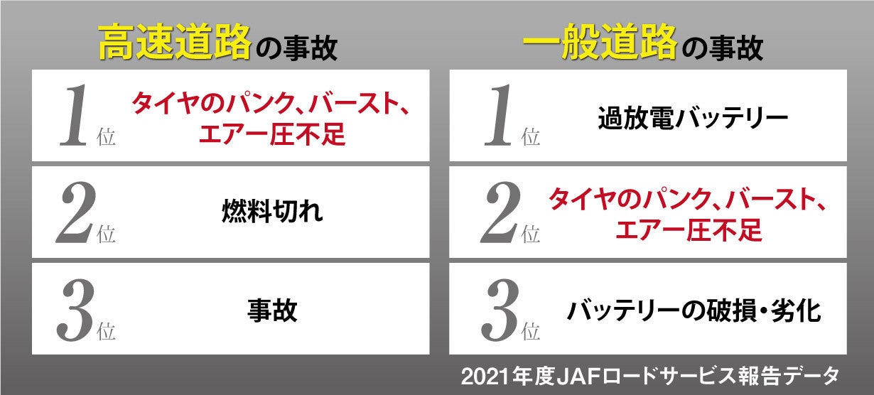 タイヤトラブルによるロードサービスの出動件数は、常に上位TOP2にランクイン