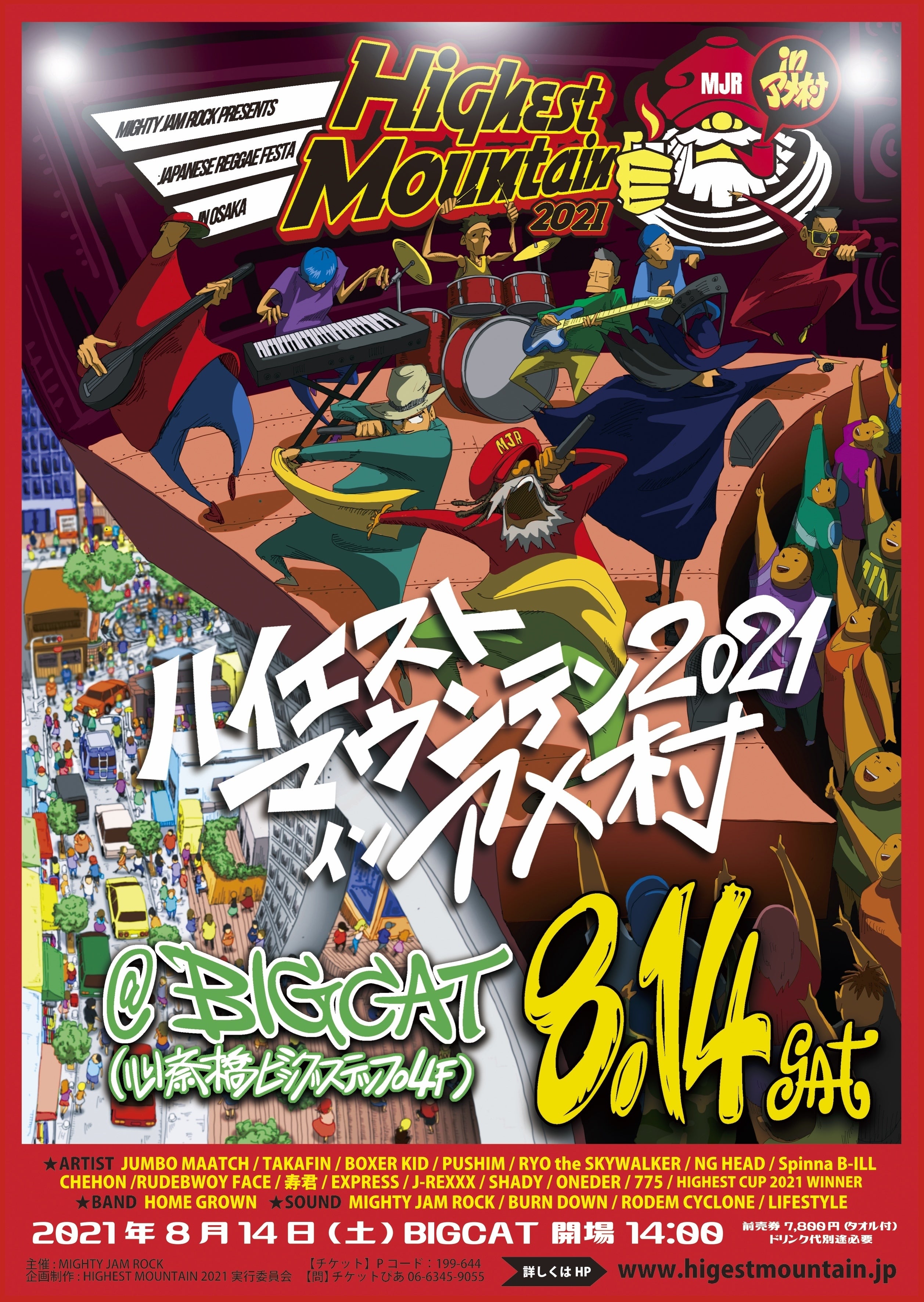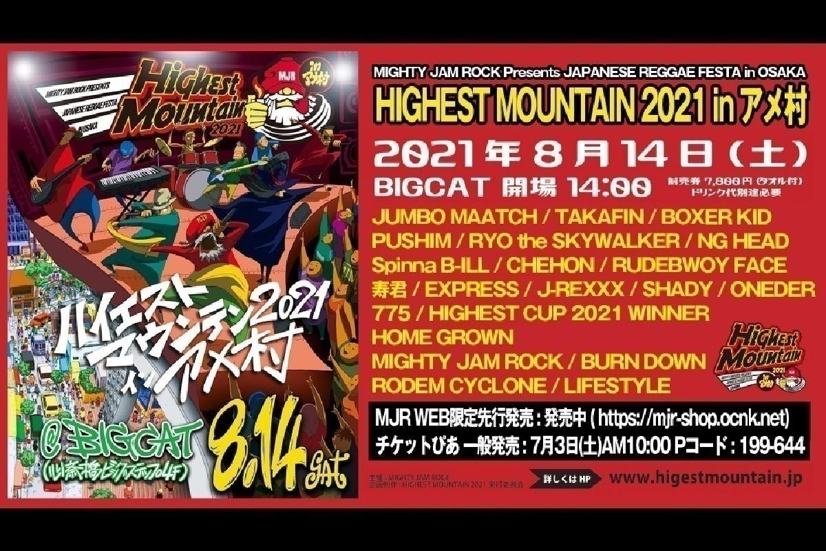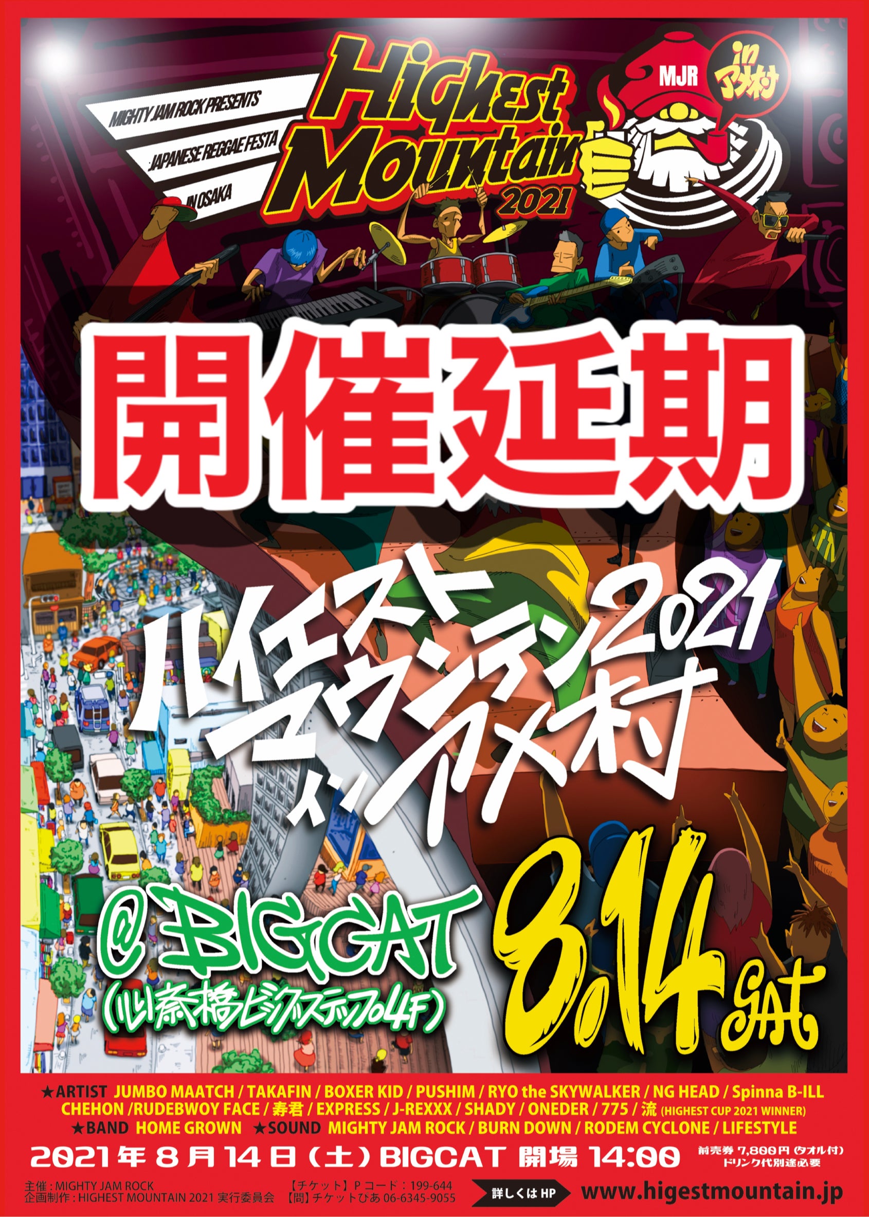 2021/08/16 17:15【HIGHEST MOUNTAIN 2021 REVENGE】※クラウドファンディングでご支援頂いた無料配信も行います!日程 : 2021年10月2日(土) OPEN 14:00会場 : STUDIO PARTITA(名村造船所跡地)>ARTISTJUMBO MAATCH / TAKAFIN / BOXER KID / PUSHIM / RYO the SKYWALKER / NG HEAD / Spinna B-ILL / RUDEBWOY FACE / 寿君 / TAK-Z / EXPRESS / J-REXXX / ONEDER / VIGORMAN / 775 / 流(HIGHEST CUP 2021 WINNER)>BANDHOME GROWN>SOUNDMIGHTY JAM ROCK / BURN DOWN / RODEM CYCLONE / LIFESTYLE※延期開催の為、出演予定だったCHEHON、SHADYの出演はキャンセルとなり、追加アーティストでTAK-ZとVIGORMANが出演決定となりました。※延期公演は8/14の公演チケットで入場可能となります。 もっと見る開催延期のお知らせ