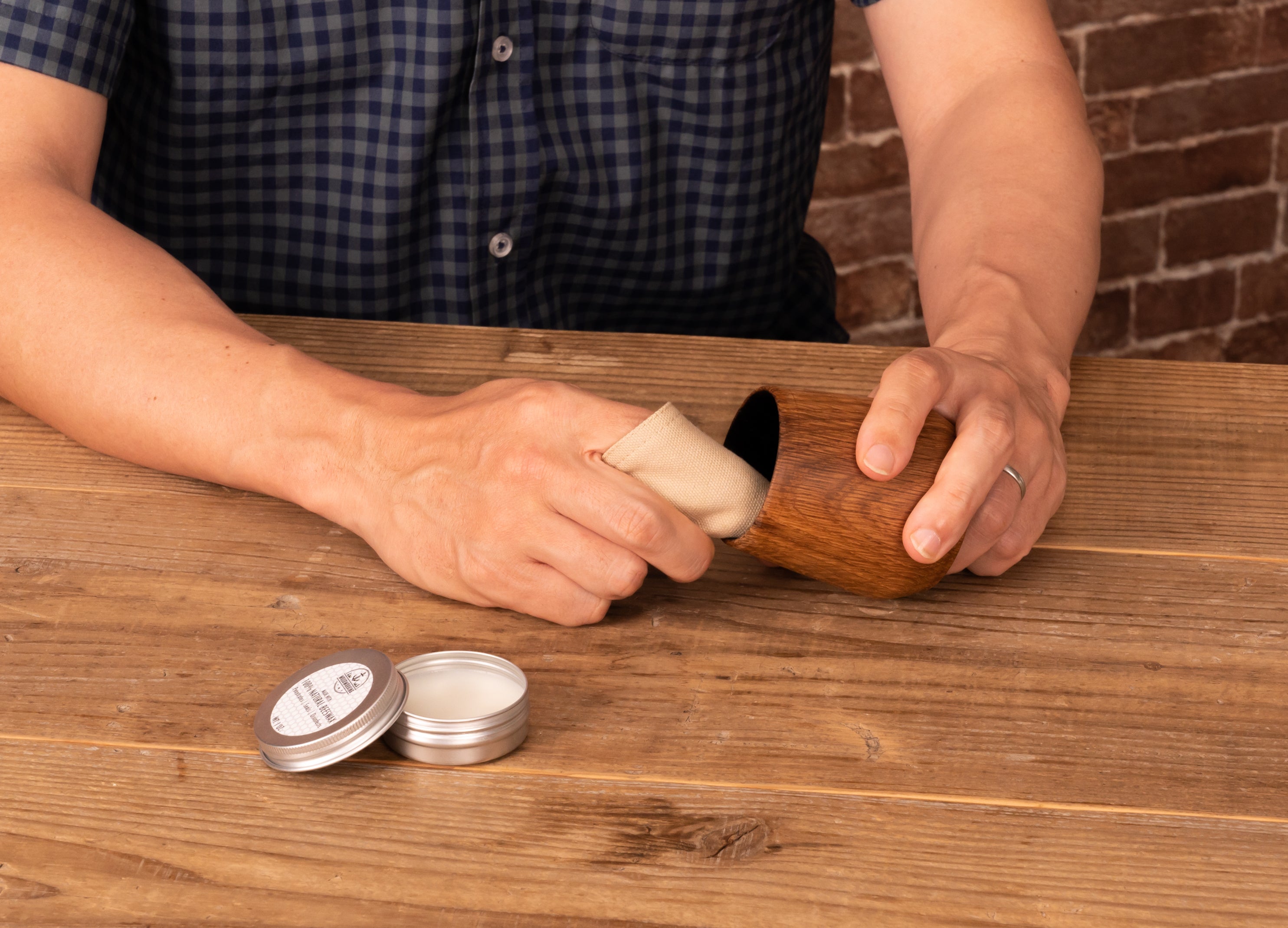 付属の天然蜜蝋クリームでお手入れすることで、磨くほどに艶が出、より上質な外観に。