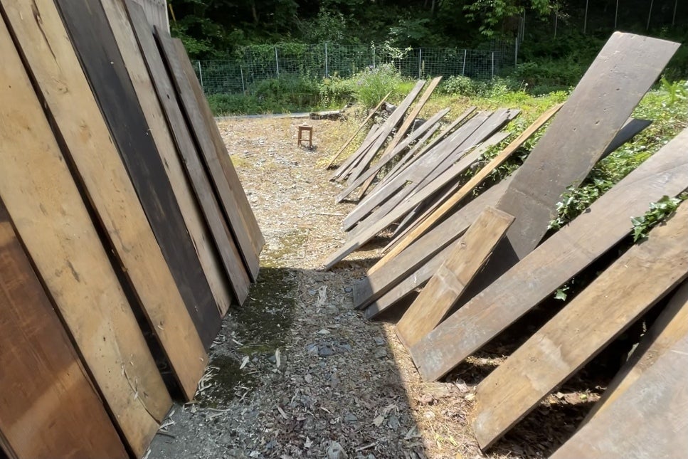 環境に優しいドッグランを目指し、できるだけ古民家の廃材や間伐材をフェンスやウッドデッキに再利用します。そのため、木材代は低く設定しています。