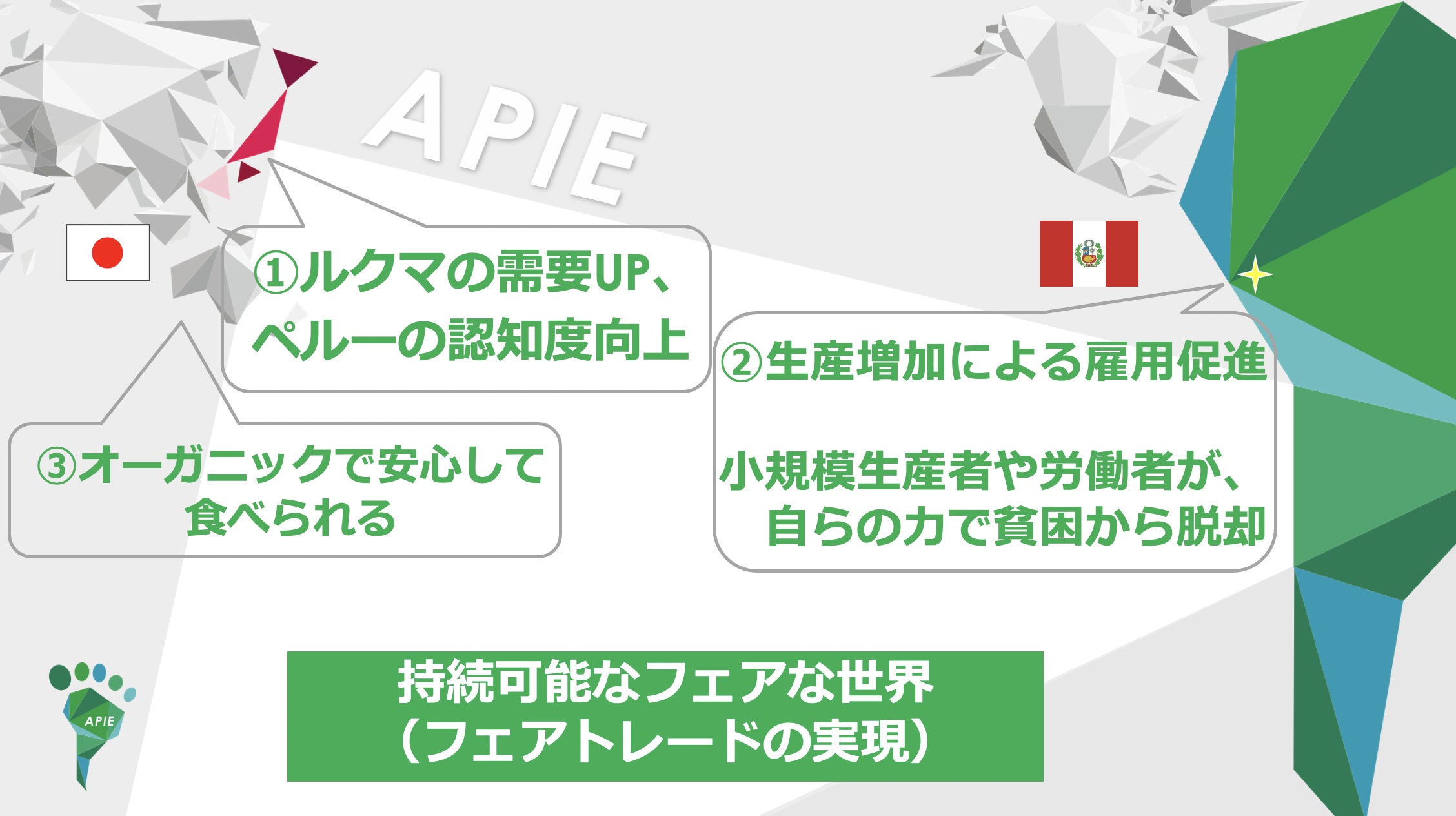 私たちは、今存在している日本と南米との認識の乖離やギャップを埋め、相互理解を深める所からフェアトレードが始まると考えています。ここでいう「フェア」とは、それぞれの文化や価値観を慕い、APIEに関わると心豊かに皆が満たされること。まずは「南米ペルー」と日本の架け橋となり、この事業を通しペルーの社会問題の解決にも寄与したいと考えています。